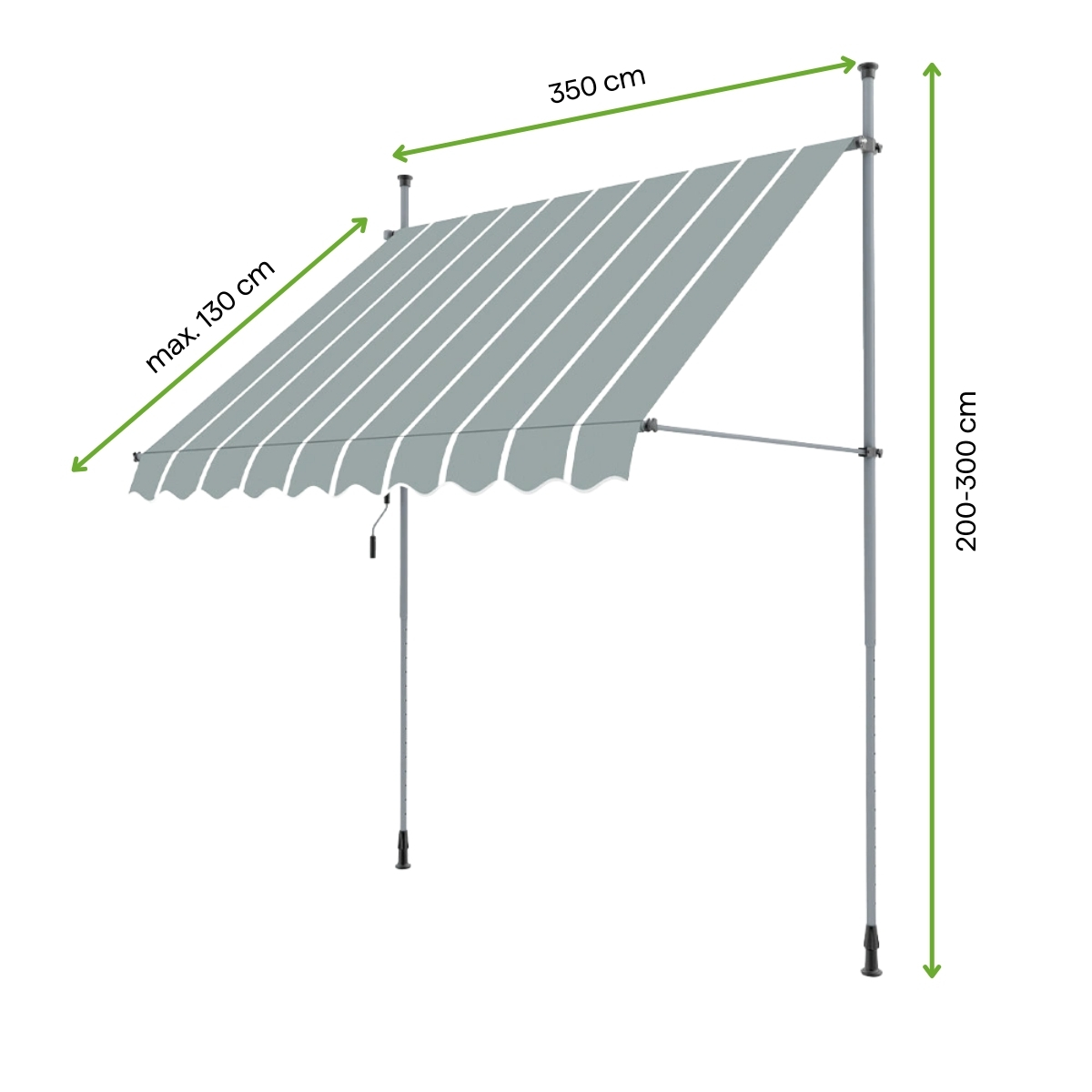 Balkonová markýza EASY 350x130 Grey je praktické a stylové řešení ochrany před sluncem a deštěm, ideální pro balkon nebo terasu. Je vyrobena z odolného polyesteru 280 g/㎡ s PU povlakem, nabízí vysokou odolnost proti UV záření a jednoduchou údržbu. Instalace bez vrtání umožňuje rychlé a bezpečné postavení markýzy bez narušení fasády. Kličkou nastavitelná délka látky umožňuje přizpůsobit množství stínu vašim individuálním potřebám a teleskopické nohy zajišťují stabilitu konstrukce. Výrobek splňuje normy CE, což potvrzuje jeho kvalitu a bezpečné používání.