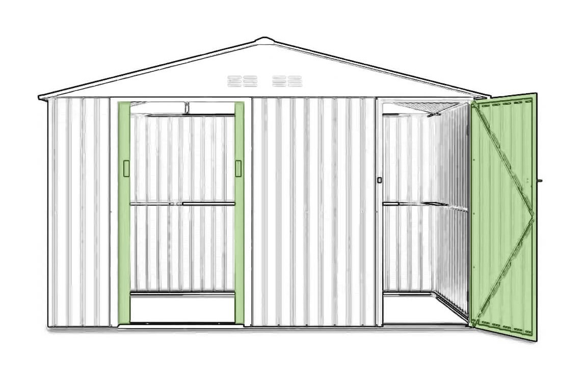 Dvojité posuvné dveře Falcon umožňují snadné vnášení většího zahradního vybavení, aniž by při otevírání zabíraly místo, což je praktické řešení pro malé zahrady. Do menší místnosti vedou výklopné dveře pro pohodlný přístup do interiéru.
