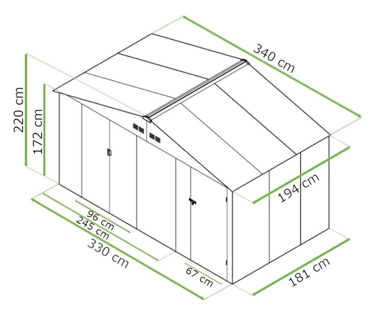 Domek na nářadí FALCON je funkční a stylové řešení pro zahradu, které umožňuje udržovat pořádek a estetiku prostoru. Konstrukce se skládá ze dvou místností: menší (85x181 cm) pro drobné nářadí a větší (245x181 cm) pro vybavení, jako je sekačka na trávu. Každá místnost má samostatný vchod, což usnadňuje organizaci. Vyroben z pozinkované oceli, domek je odolný proti korozi, UV záření a vlhkosti. Šikmá střecha účinně odvádí vodu a sníh, chrání konstrukci před přetížením. Větrací otvory zajišťují cirkulaci vzduchu a okno z PVC osvětluje interiér. Jednoduchá montáž z něj činí praktickou volbu, která spojuje trvanlivost a estetiku.