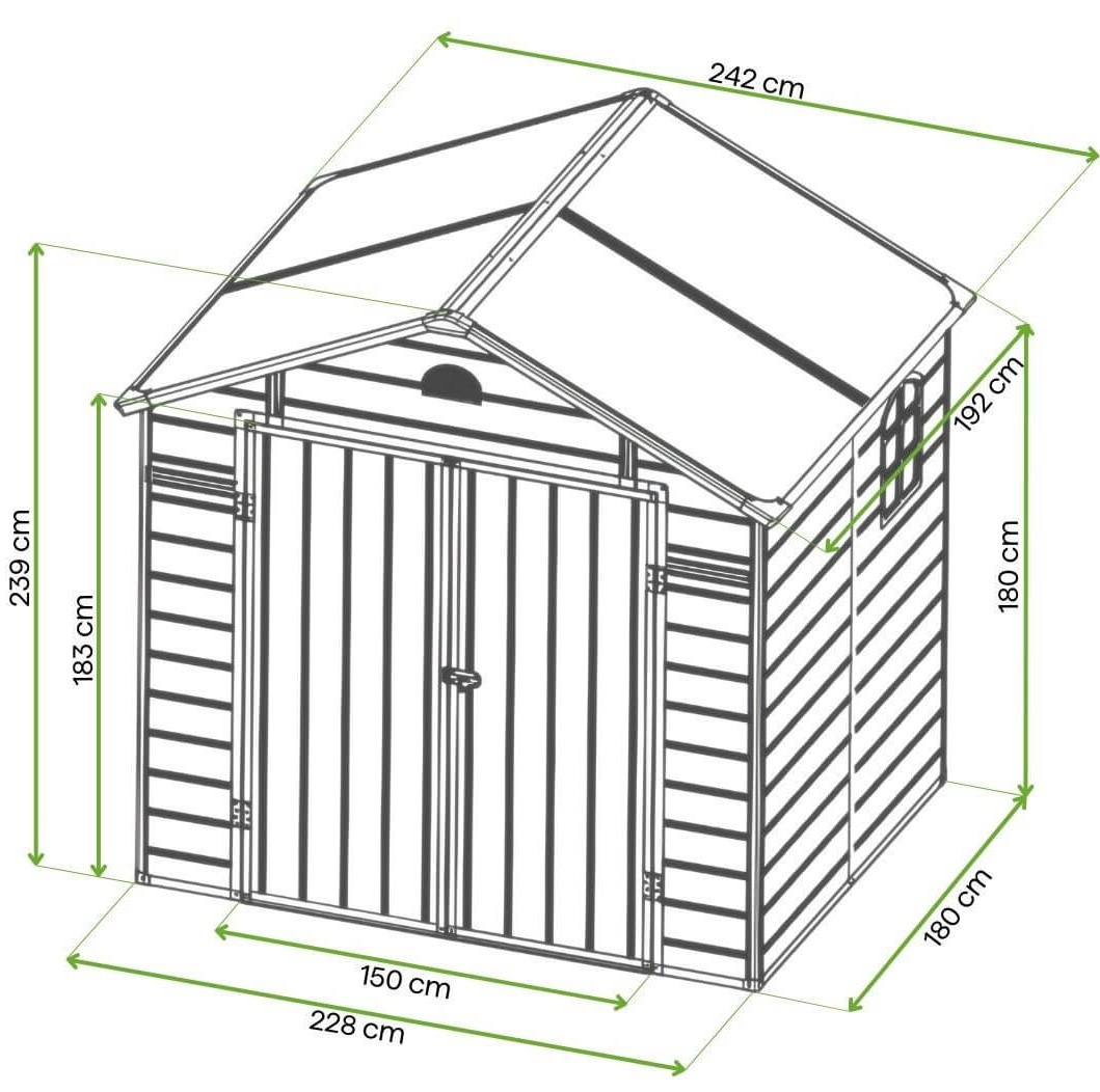 Chatka VERMONT je vybavena širokými dvojitými dveřmi, které usnadňují přístup do interiéru bez ohledu na velikost uložených předmětů. Zámek se závěrem nabízí možnost montáže visacího zámku (není součástí dodávky) pro větší ochranu.