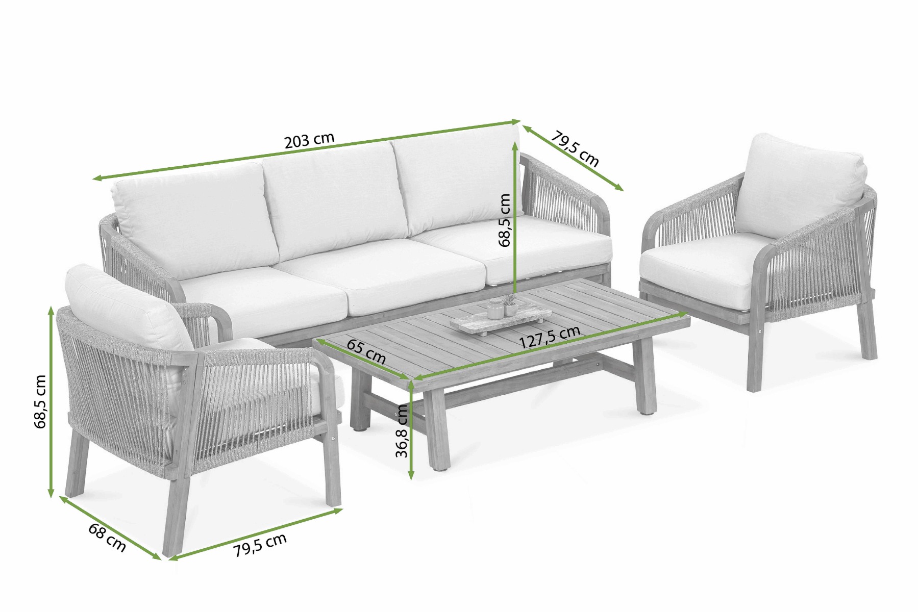 Konstrukce nábytku je postavena na pevném rámu z masivního akáciového dřeva, což zaručuje stabilitu a odolnost vůči vnějším vlivům. Promyšlený design, zesílené spoje a přesné lícování prvků přispívají k životnosti a spolehlivosti soupravy. Opěradla z dekorativního výpletu z odolné nylonové šňůry dodávají vizuální lehkost i větší pohodlí při používání.