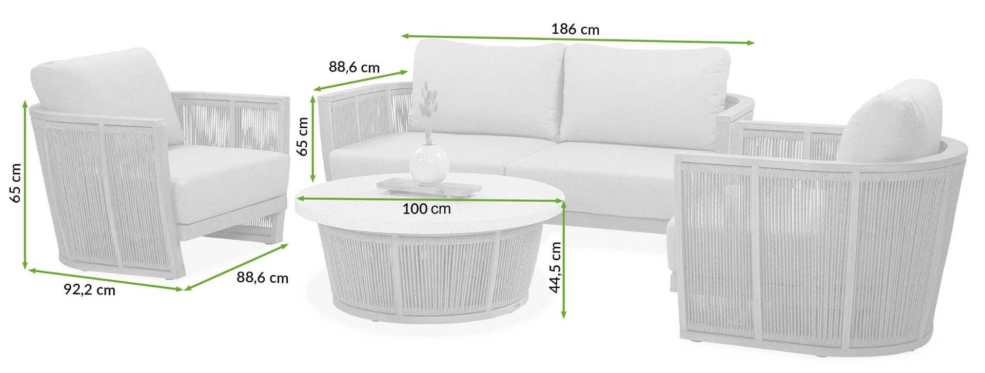 Collins Caffe od společnosti Furrore je kompaktní a stylová sestava nábytku, ideální pro menší prostory. Skládá se z dvoumístné pohovky, dvou křesel a konferenčního stolku. Všechny kusy jsou vyrobeny z odolného eukalyptového dřeva, které zajišťuje stabilitu a odolnost vůči povětrnostním vlivům. Díky svému nadčasovému designu poskytuje souprava elegantní a funkční posezení na terase nebo balkoně.
