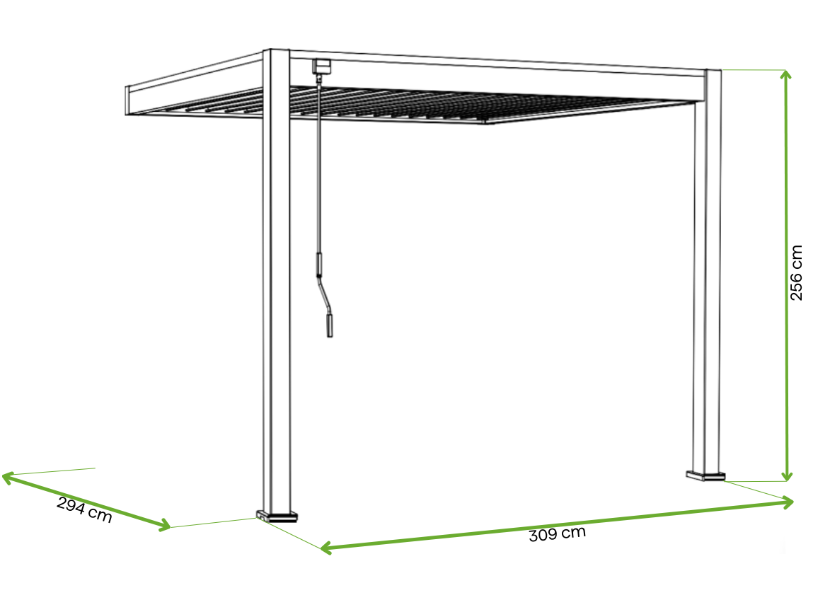 Pergola je vybavena hliníkovými střešními lamelami, které lze otáčet v rozsahu 135°, což umožňuje přesně regulovat množství světla. V horkých dnech lze vytvořit příjemný stín a za chladnějších večerů pootevřít lamely, aby byl zajištěn přísun čerstvého vzduchu. Intuitivní ovládací mechanismus funguje plynule a nevyžaduje velkou sílu, což umožňuje rychlou a pohodlnou změnu nastavení. Díky tomu je přizpůsobení pergoly aktuálním povětrnostním podmínkám jednoduché a pohodlné.
