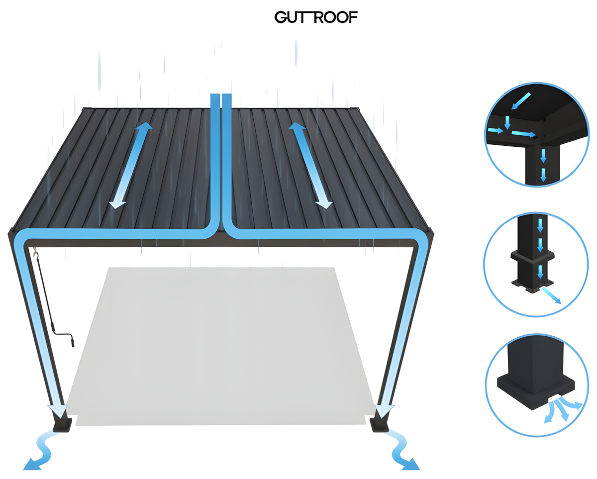 Pergola je vybavena integrovaným okapovým systémem, který účinně odvádí dešťovou vodu a zajišťuje suchý a komfortní prostor pod zastřešením. Díky promyšlené konstrukci je dešťová voda odváděna speciálními kanálky ve sloupcích konstrukce, což eliminuje riziko jejího hromadění na povrchu střechy. Toto praktické řešení umožňuje používat pergolu i za nepříznivých povětrnostních podmínek bez obav ze stojaté vody.