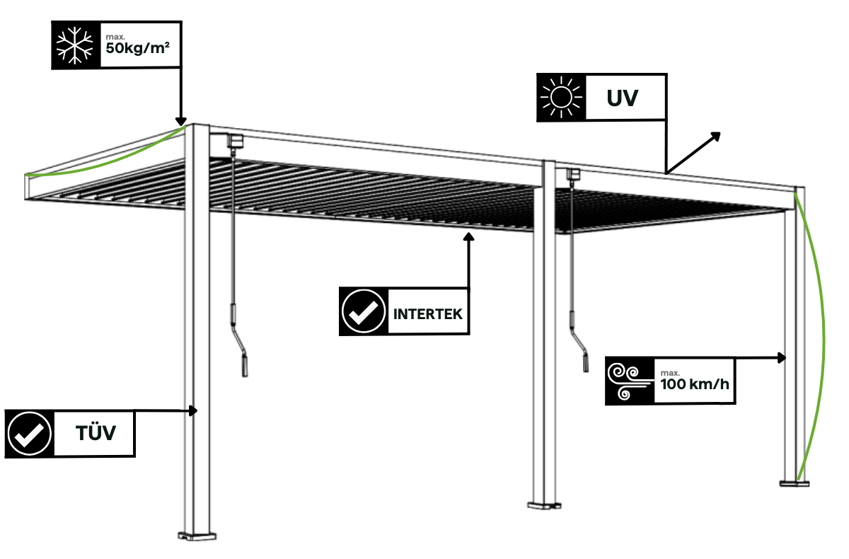 Pergola byla navržena s ohledem na trvanlivost a odolnost vůči nepříznivým povětrnostním podmínkám. Její robustní konstrukce odolá náporům větru až 100 km/h a zátěži sněhem až 50 kg/m², což zaručuje stabilitu jak v létě, tak v zimě. Pergola má také certifikáty TÜV a Intertek, které potvrzují její vysokou kvalitu zpracování a splnění přísných bezpečnostních norem. Je to spolehlivé řešení, které poskytne pohodlí a klid po celý rok.