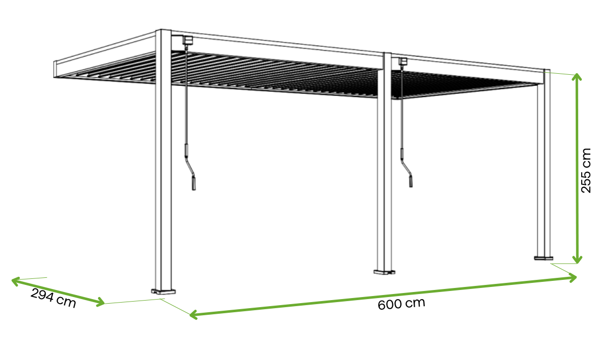 Při instalaci pergoly je třeba zachovat mírný sklon – přibližně 0,5˚, což odpovídá 1 cm na každý 1 metr délky – aby bylo zajištěno účinné odvádění dešťové vody. Tím se zabrání jejímu hromadění na střeše a zvýší se komfort a životnost konstrukce. Více informací naleznete v návodu.