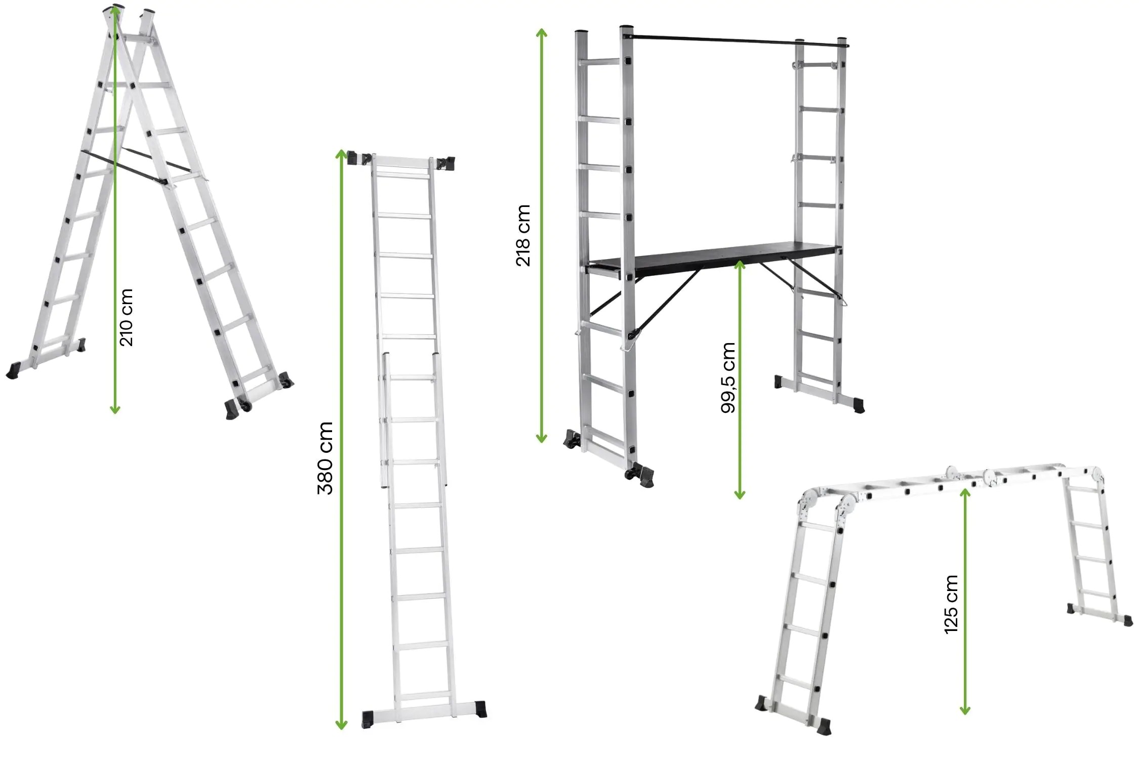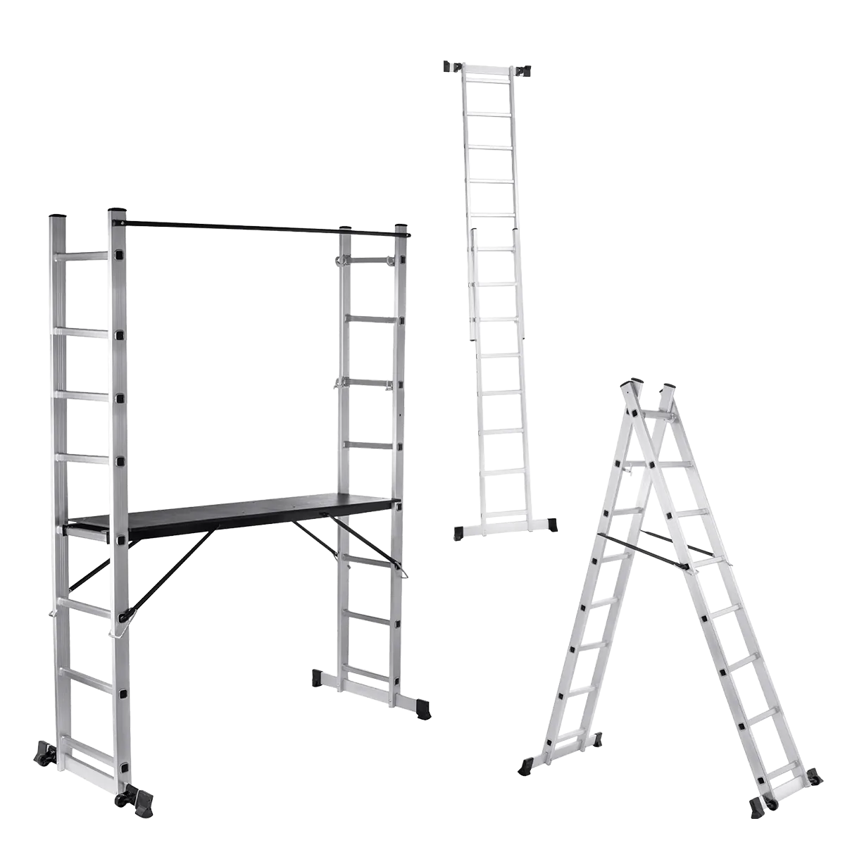 Toto lešení je univerzální zařízení, které se snadno přemění na pracovní plošinu, štafle nebo volně stojící žebřík (typ "A"). Díky této pozoruhodné funkčnosti vám jeden nástroj postačí na různé práce kolem domu, na zahradě nebo na staveništi a ušetří vám čas i peníze.