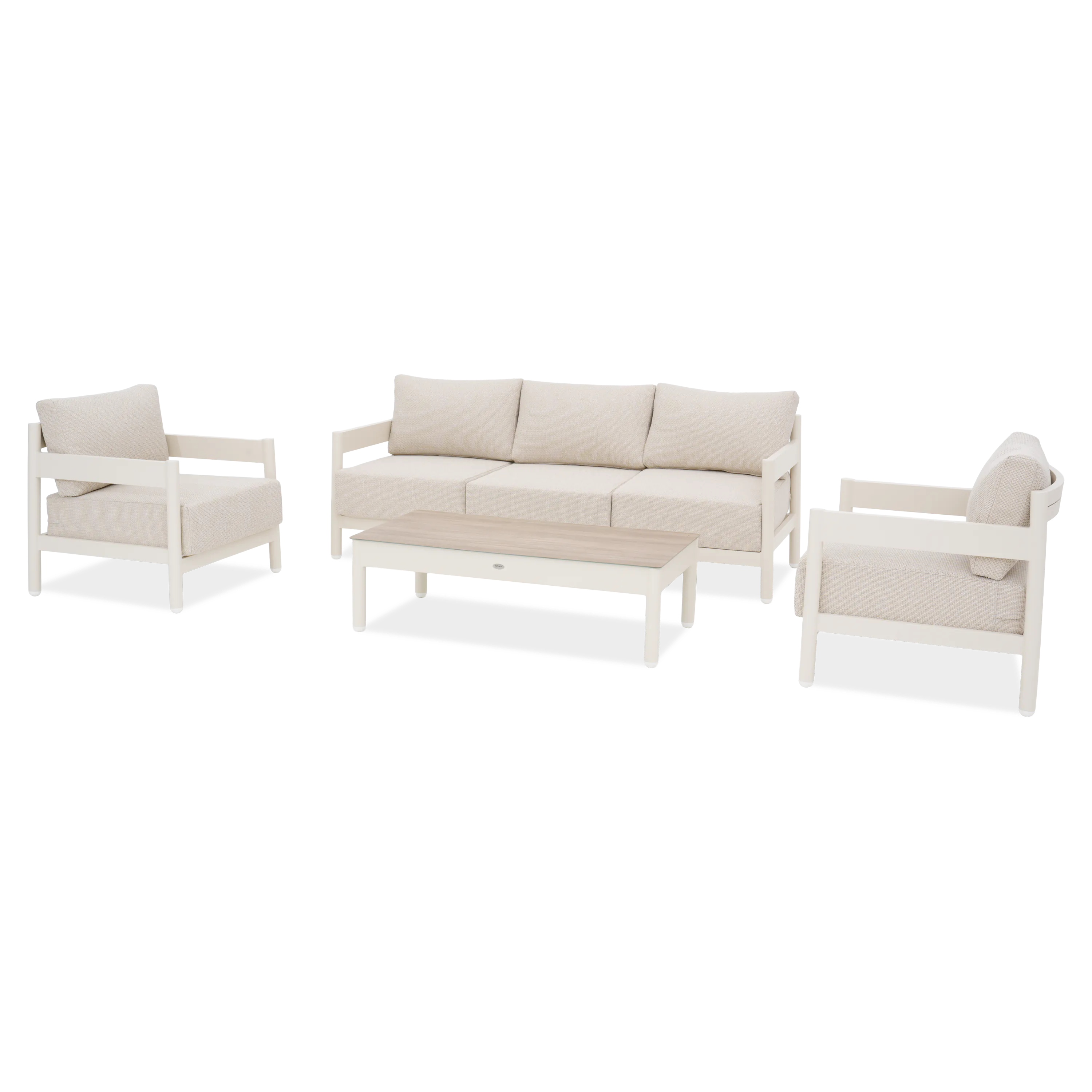 Luxusní hliníková souprava nábytku TREVIO CAFFE Beige od společnosti FURRORE, která se skládá ze dvou křesel, třímístné pohovky a konferenčního stolku, je definicí moderní relaxace. Hliníkový rám s práškovým nástřikem zaručuje odolnost, zatímco keramické sklo na desce stolu dodává eleganci. Pohodlí zajišťují působivé polštáře sedáků z olefinové tkaniny o tloušťce 20 cm se zipy. Vyberte si tuto soupravu nábytku ideální na terasu a zahradu a vytvořte si relaxační prostor!