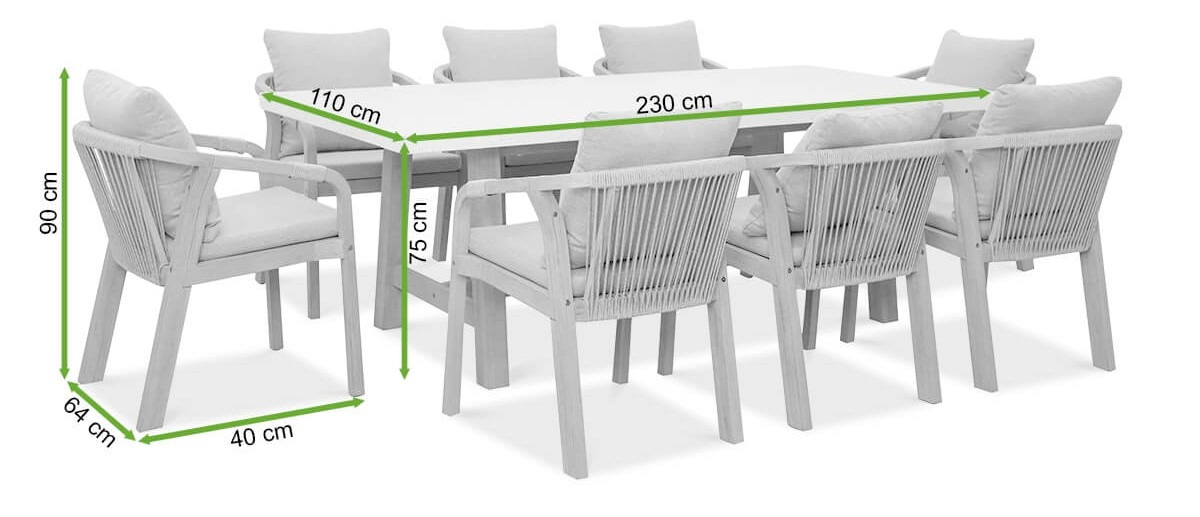 Jídelní set Jacob 8+1 od společnosti Furrore je reprezentativní sada zahradního nábytku vyrobená z odolného akáciového dřeva. Sada obsahuje velký stůl a osm pohodlných židlí. Masivní konstrukce z masivního dřeva zaručuje stabilitu, zatímco polštáře podtrhují pohodlí a elegantní charakter soupravy a vytvářejí stylové místo pro společné stolování na terase nebo v zahradě.