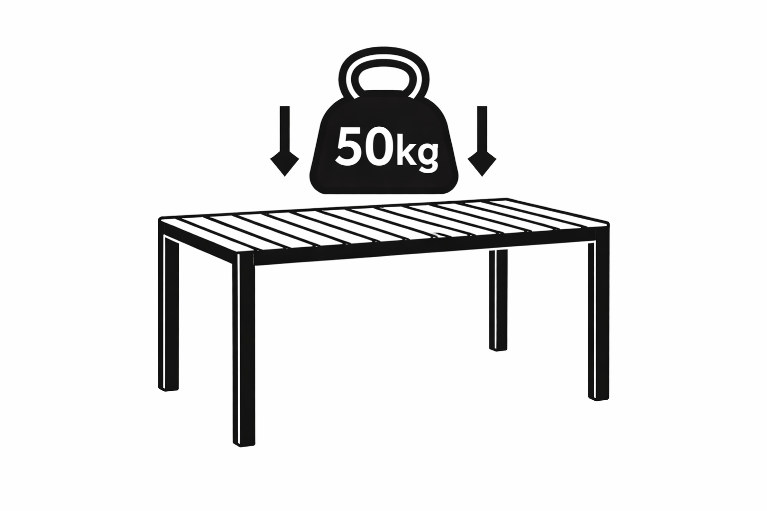 Stůl vydrží zatížení až 50 kg a je vhodný pro stolování i každodenní použití.
