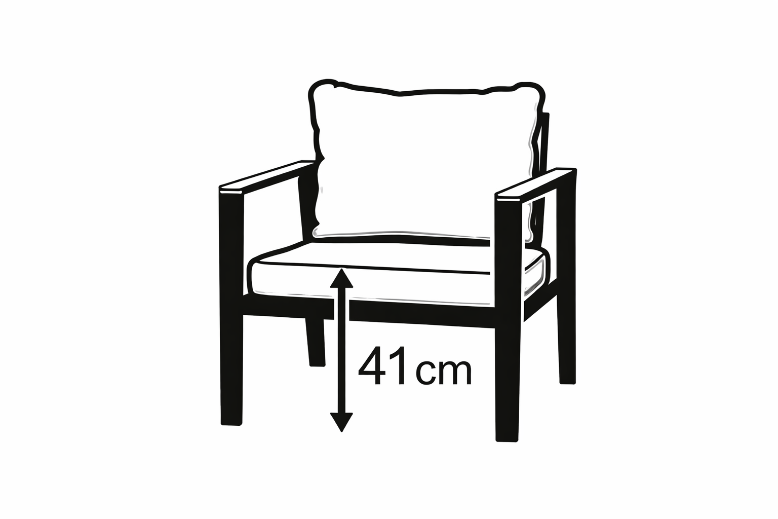 Výška sedáku je 41 cm s polštářem, přičemž konstrukční výška je 33 cm, což zajišťuje pohodlné používání u jídelního stolu.