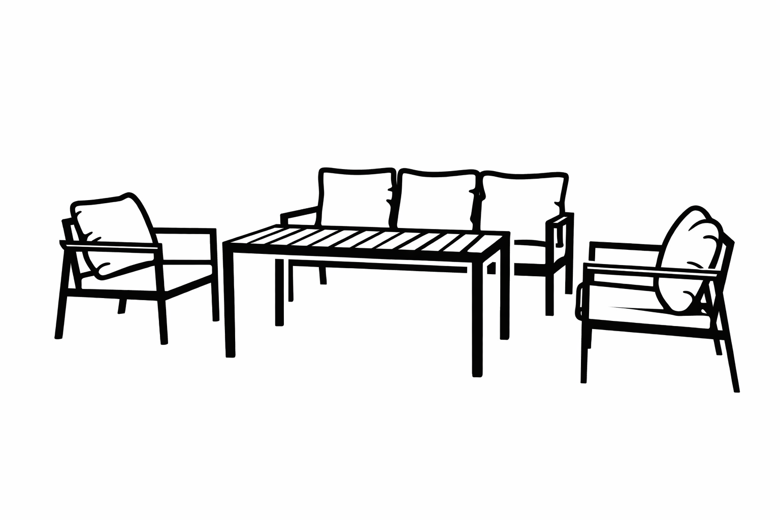 Souprava obsahuje křesla, pohovku a jídelní stůl. Jednotlivé prvky tvoří ucelený a funkční celek pro zahradu nebo terasu.