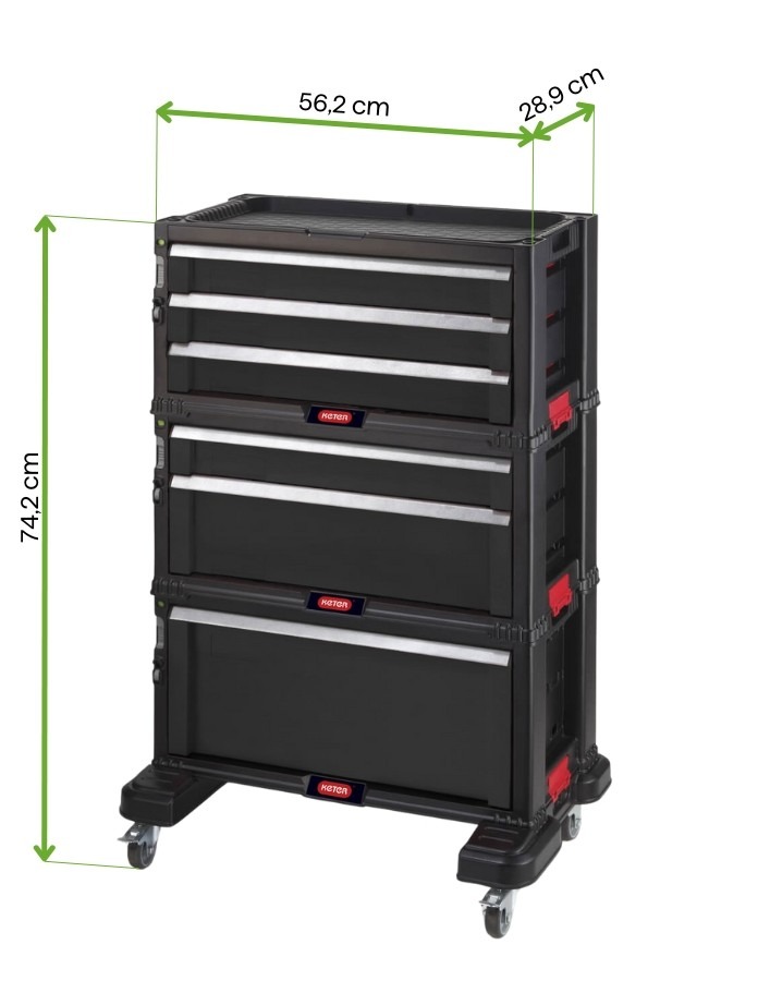 Komoda na nářadí se 6 zásuvkami – KETER je nepostradatelným úložným řešením pro každou dílnu. Díky různým hloubkám zásuvek můžete pohodlně oddělit nářadí a příslušenství a získat tak rychlý přístup k potřebným věcem. Regál je vyroben z pevného materiálu PP, vyznačuje se vysokou trvanlivostí a odolností vůči intenzivnímu používání. Vestavěná kolečka umožňují snadné přemisťování nábytku podle pracovních podmínek. S objemem 50,5 litrů a rozměry 56,2 × 28,9 × 74,2 cm model KETER zaručuje funkčnost a pořádek na každém pracovišti.