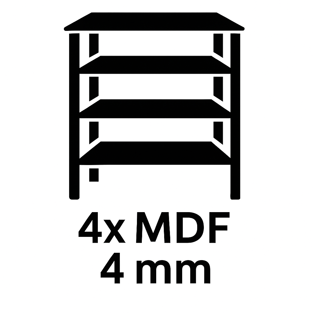 Regál je vybaven 4 robustními policemi z MDF o tloušťce 4 mm s žebrovanými nosníky, které rozkládají těžké zatížení a poskytují pevnou základnu pro každou polici o nosnosti 150 kg. Dřevo použité na výrobu polic z MDF pochází ze zdrojů s certifikátem FSC.