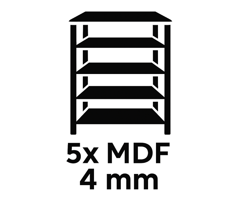 Pevná základna: 5 polic ze 4 mm MDF a žebrovaných nosníků