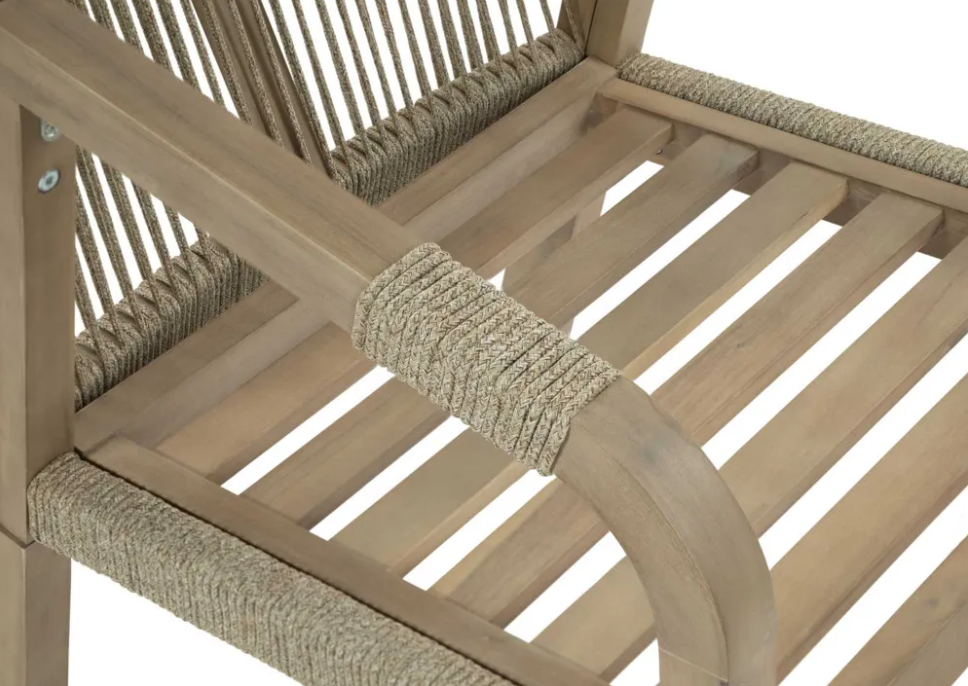 Konstrukce nábytku je založena na pevném rámu z masivního akáciového dřeva, což zaručuje stabilitu a odolnost vůči vnějším vlivům. Promyšlený návrh, zesílené spoje a přesné lícování částí zvyšují trvanlivost a spolehlivost sestavy. Opěrky z dekorativního výpletu z odolného nylonového lana dodávají vizuální lehkost a zvyšují komfort při používání.