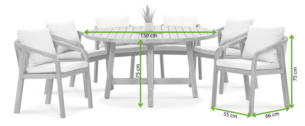 Marigold 6+1 Round od společnosti Furrore je elegantní a funkční set z přírodního akáciového dřeva s certifikátem FSC®. Obsahuje kulatý stůl o průměru 150 cm a 6 ergonomických židlí s ručně pletenými opěrkami a pohodlnými polštáři. Ideální pro společné stolování i setkávání na terase či zahradě – kombinuje odolnost, pohodlí a stylový design.