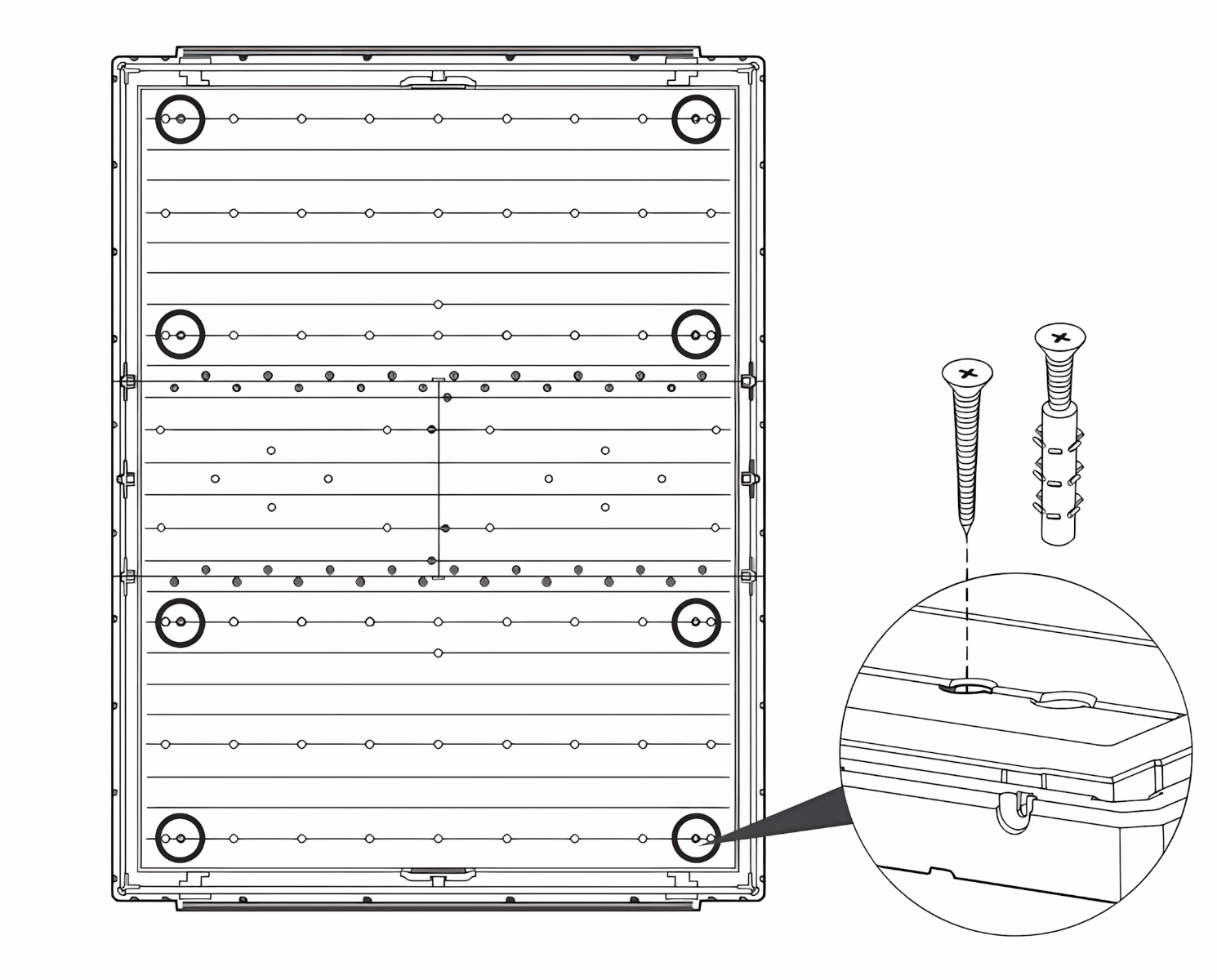Doporučujeme pro maximální stabilitu domek upevnit k podložce. V podlaze jsou speciální instalační body, které umožňují snadné přichycení pomocí vhodných šroubů (nejsou součástí balení).