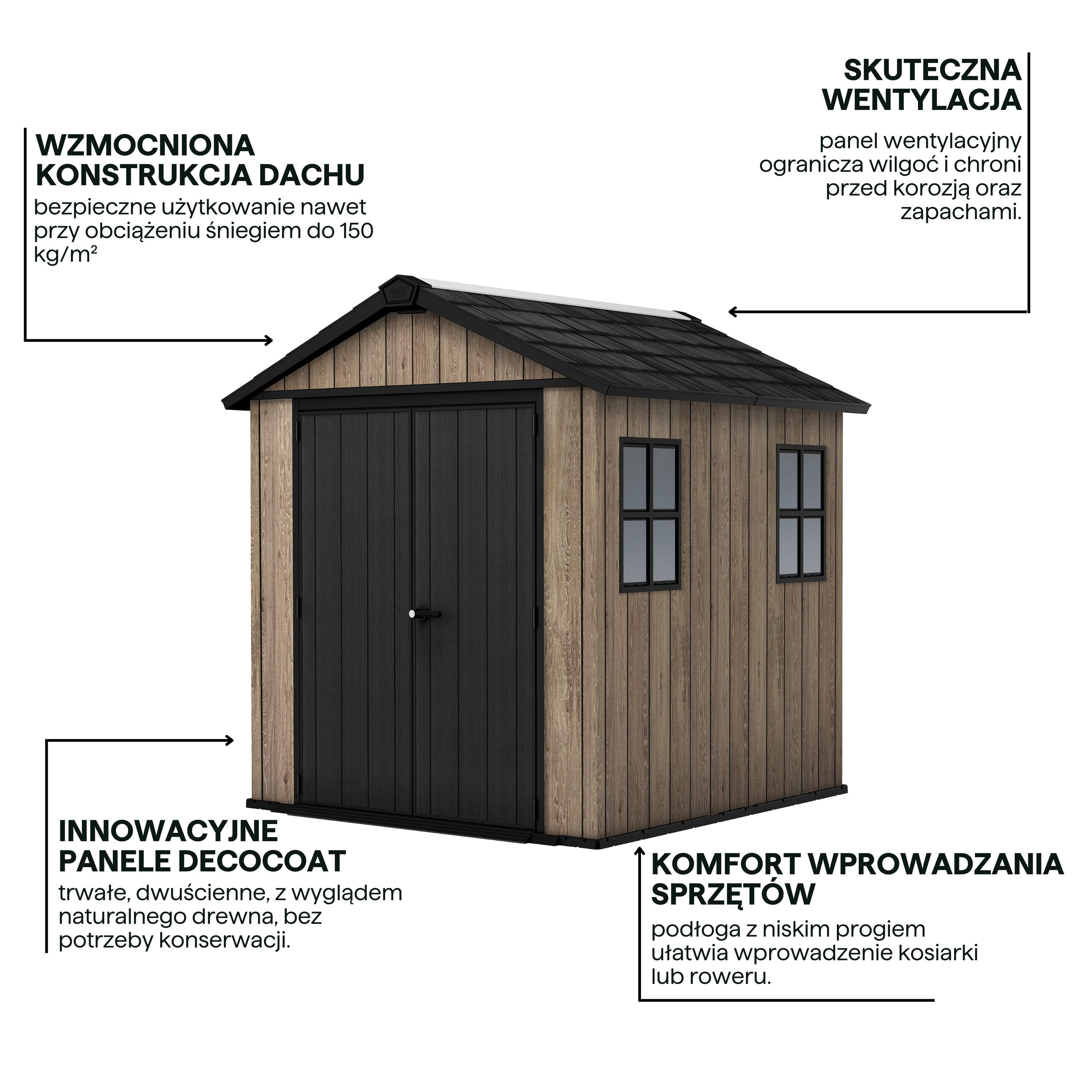 Domek na nářadí DECO APEX 757/775 ASHWOOD od společnosti Keter je luxusní celoroční domek na nářadí vyrobený z panelů DecoCoat, které imitují dřevo. Odolnost zaručují ocelové výztuhy a střecha, která vydrží až 150 kg/m² sněhu . Má 2 okna ve viktoriánském stylu, střešní okno, ventilaci a odolnou podlahu. Je bezúdržbový - nerezaví a není třeba jej natírat. Domek má navíc nízký práh pro snadný vstup s těžkými předměty.