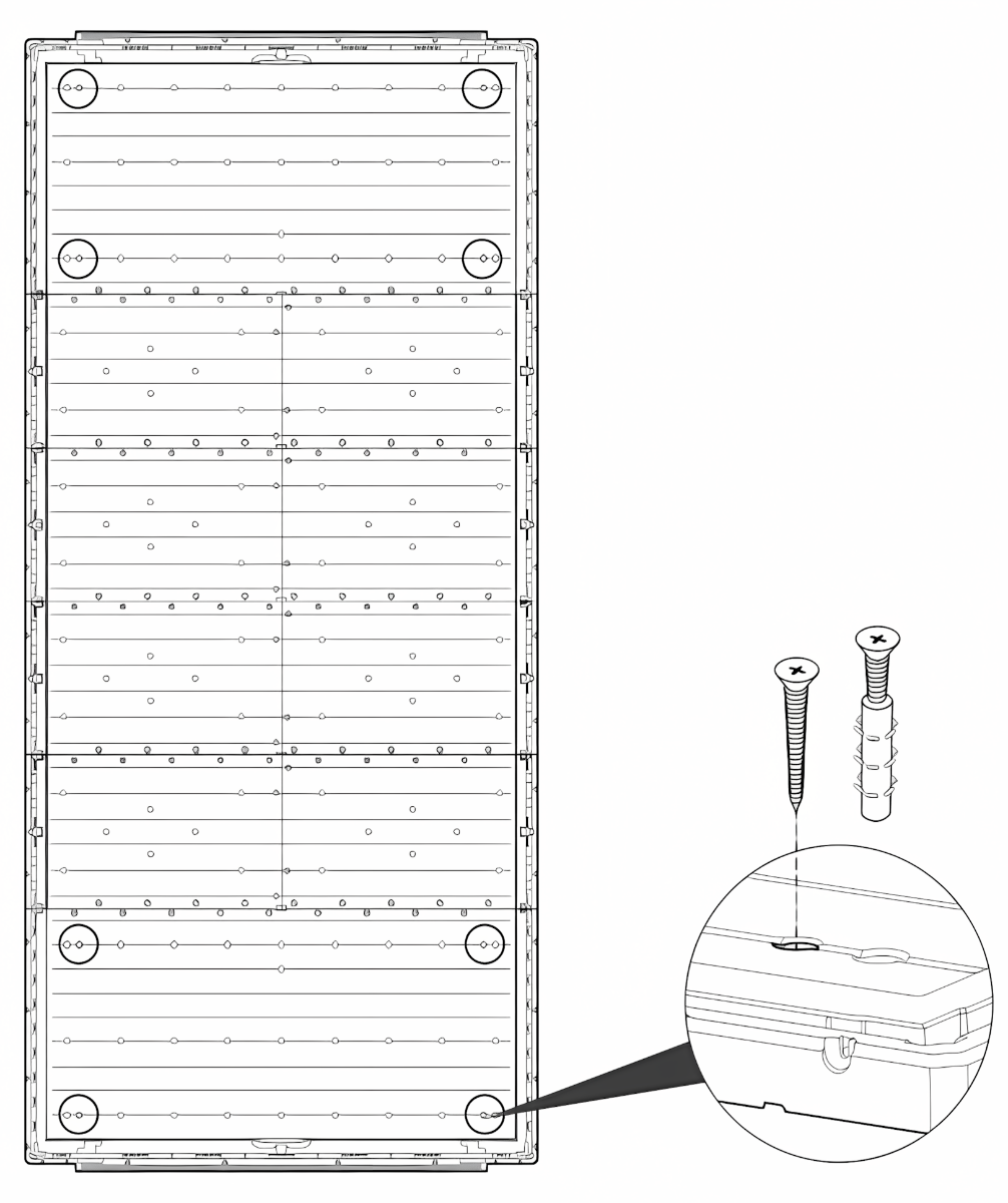 Pro zajištění úplné stability se doporučuje bungalov Keter Oakland 7511 připevnit k zemi. V podlaze jsou vyhrazené montážní body, které usnadňují upevnění pomocí vhodných šroubů (nejsou součástí dodávky).