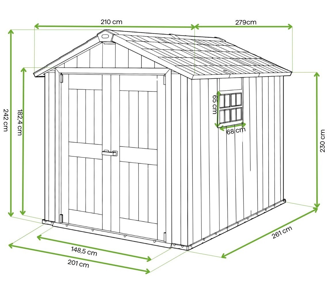 Prostorný zahradní domek Keter Oakland 759 (210 × 279 × 242 cm) je ideální pro uložení nářadí, zahradního nábytku nebo rekreačních zařízení. Je vyroben z moderního kompozitu Duotech imitujícího dřevo, který je odolný proti UV záření a nepříznivým povětrnostním podmínkám. Má pevnou podlahu (150 kg/m²), sedlovou střechu se střešním oknem, široké dvoukřídlé dveře s ocelovým zámkem a natíratelné stěny. Kovové výztuhy a 12letá záruka zajišťují dlouhou životnost. Snadná montáž – není potřeba žádné odborné nářadí.