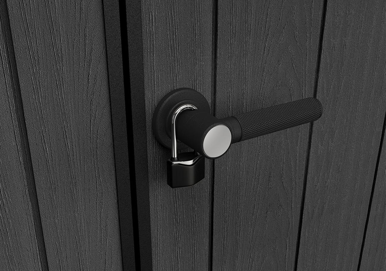 Robustní dveře zajišťují dlouhodobou spolehlivost, zatímco ocelový zámek s možností zavěšení na visací zámek účinně chrání obsah altánu před neoprávněným přístupem.