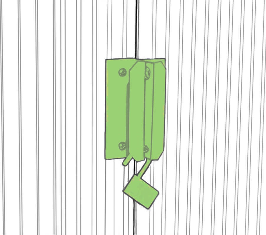 Dveře domku na nářadí OREGON byly navrženy s úchyty, které umožňují připevnění visacího zámku. Toto praktické řešení zvyšuje ochranu interiéru, ale upozorňujeme, že visací zámek není součástí výrobku.
