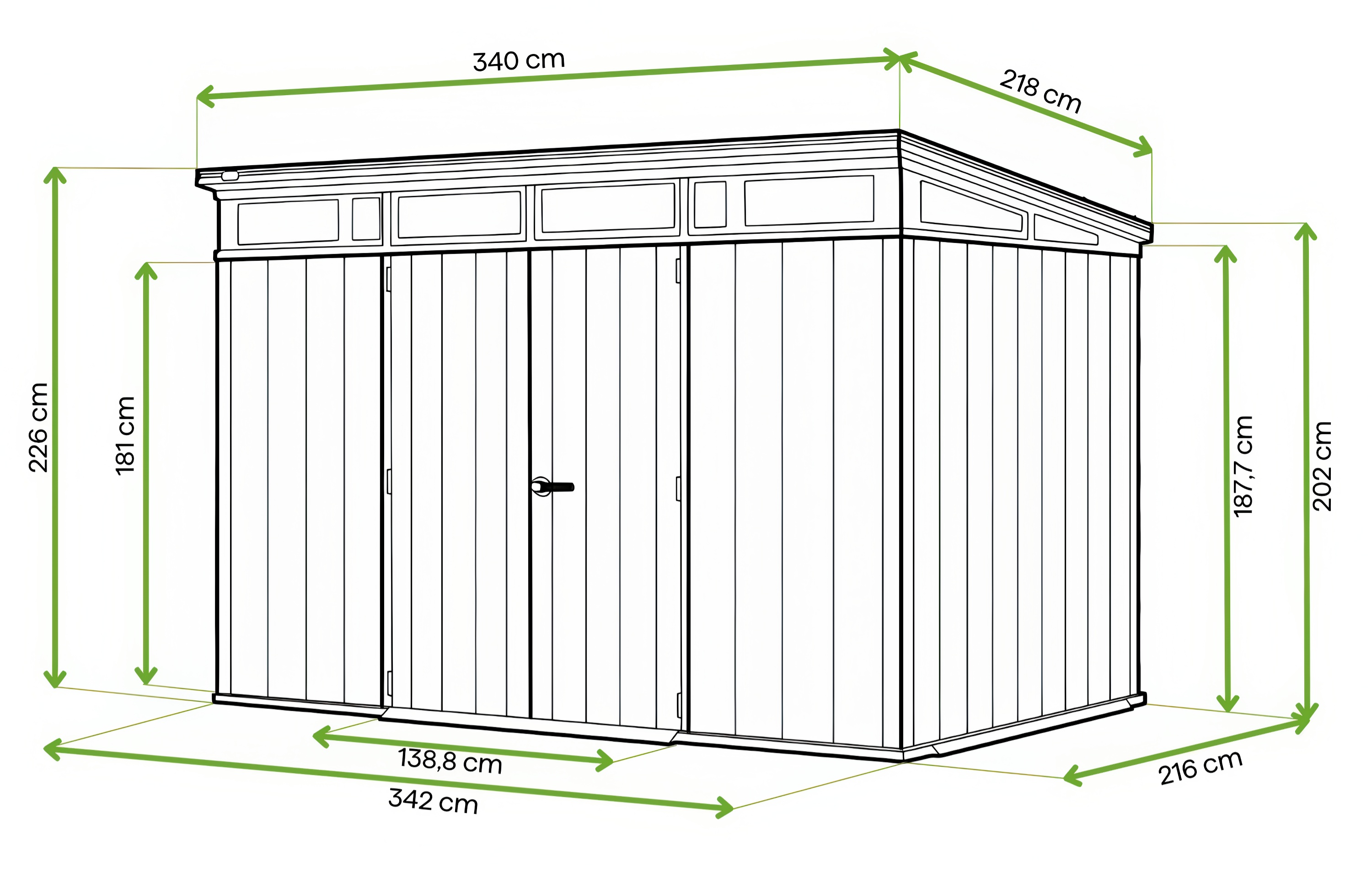 Chatka vyniká vysokou funkčností a nabízí prostorný úložný prostor pro různé užitečné předměty - od zahradního nářadí a příslušenství až po těžké vybavení, jako jsou sekačky s pojezdem.