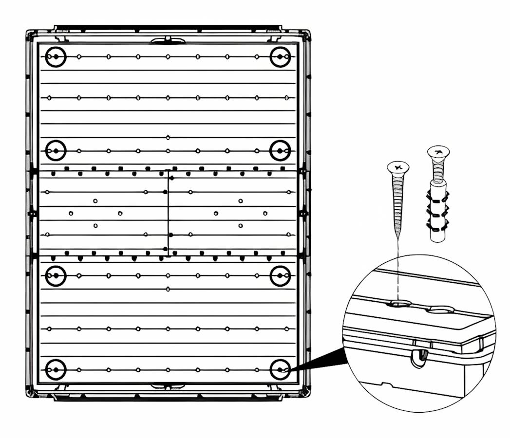 Upevnění: Doporučuje se bezpečně upevnit domek k podlaze pro maximální stabilitu. V podlaze jsou speciálně připravené montážní body, které umožňují snadné uchycení konstrukce pomocí vhodných šroubů (nejsou součástí balení).