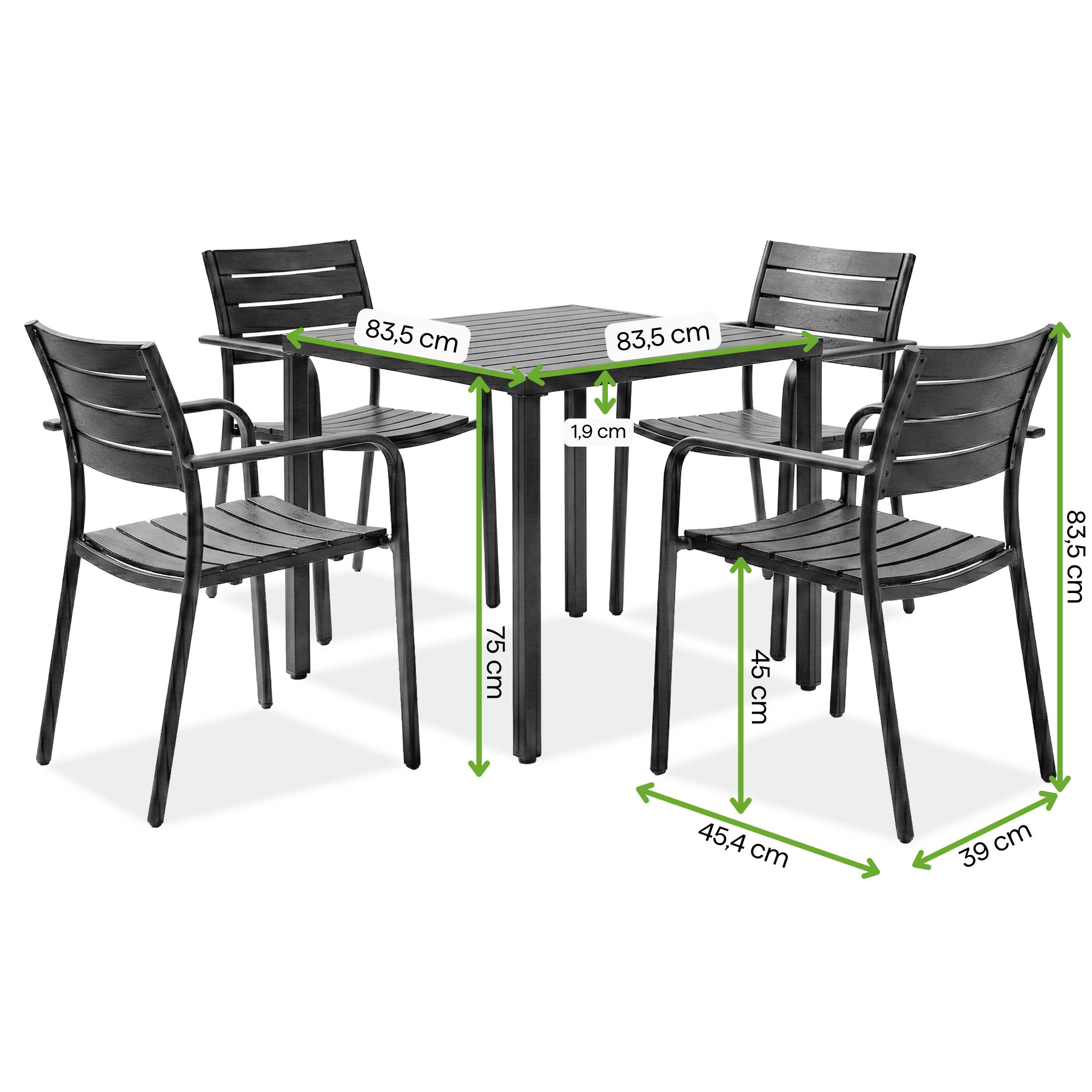 Terasová souprava MILO/BRIS Black Beige - Bjørkka je moderní terasový nábytek kombinující odolnost, funkčnost a estetiku, určený pro soukromé i komerční využití. Židle MILO jsou vyrobeny z PP plastu odolného proti UV záření, mají ergonomické sedadlo a kovovou konstrukci s práškovým nástřikem; model je stohovatelný a má nosnost až 150 kg. Stůl BRIS má masivní desku a kovové nohy s elektroforetickým povrchem pro venkovní použití; jeho rozměry jsou 83,5 × 83,5 × 75 cm. Celou sadu doplňují protiskluzové nožky a konstrukce stolu využívá nastavitelné podložky pro stabilní umístění na nerovném povrchu.