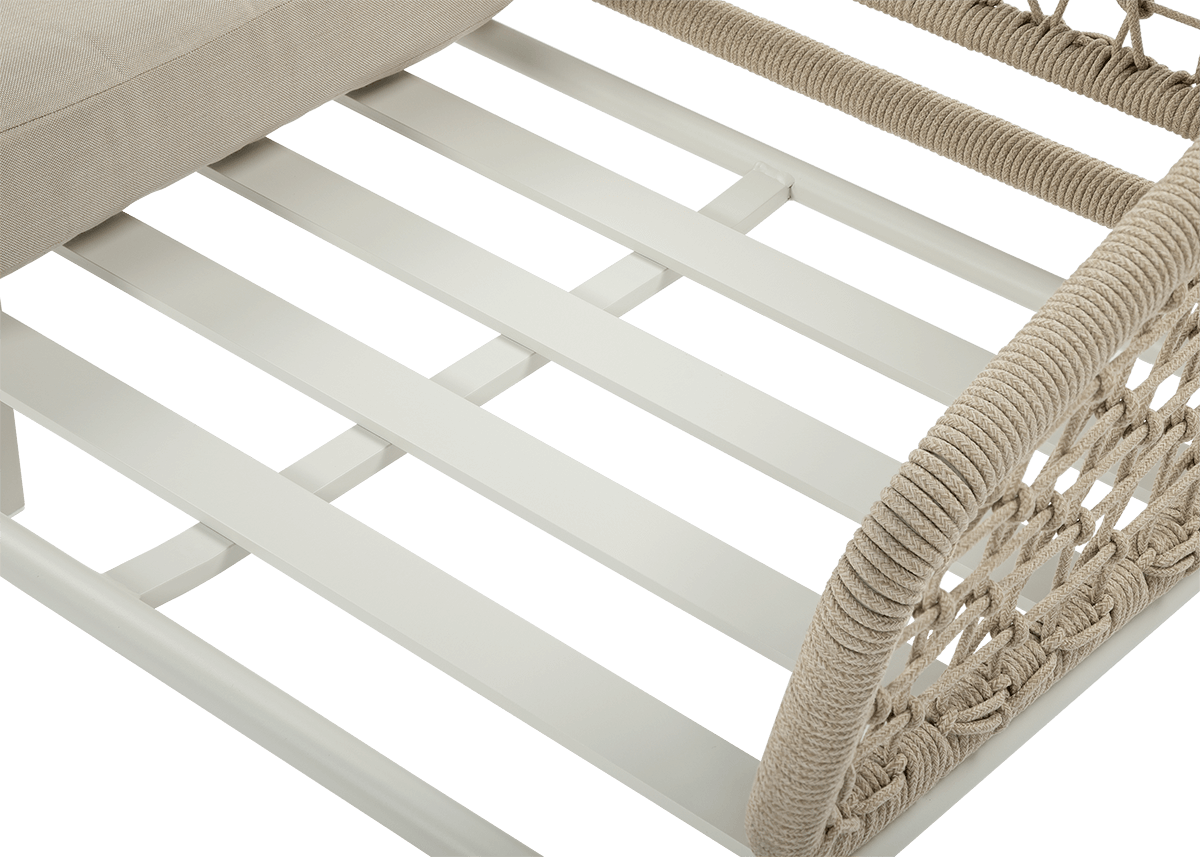 Rám nábytku je vyroben z odolného práškově lakovaného hliníku, který zajišťuje odolnost proti korozi a nepříznivým povětrnostním podmínkám. Konstrukci obepíná ozdobné lano, které dodává celé soupravě originální charakter a zároveň posiluje její odolnost. Díky takové kombinaci materiálů souprava dobře funguje venku po mnoho ročních období, kombinuje moderní styl s výjimečnou pevností.