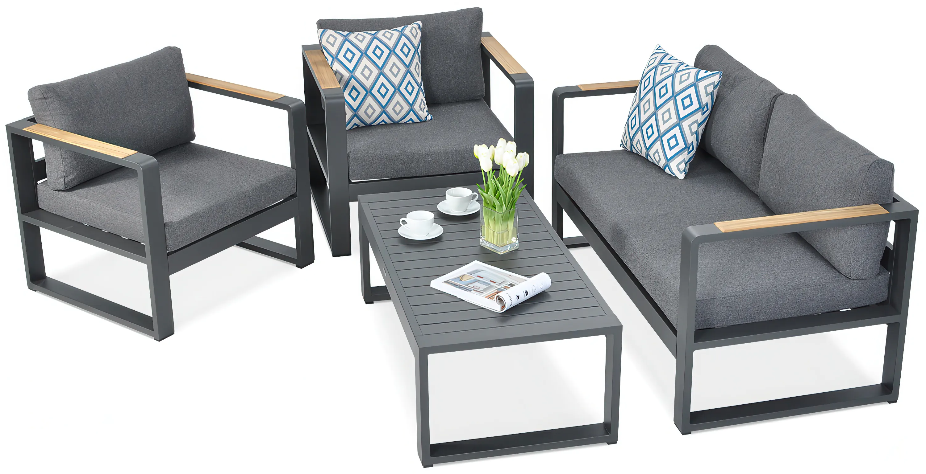 4 kusy nábytku a mnoho využití, sedací souprava Panama Anthracite obsahuje dvoumístnou pohovku, dvě rozšířená křesla a konferenční stolek. Všechny prvky spojuje fantastický design, pevné provedení a mimořádná životnost. Zahradní nábytek ze sedací soupravy Panama je vyroben z hliníku – materiálu lehkého, a přitom velmi odolného. Souprava Panama Anthracite odolá dešti, slunečnímu záření i prudkým výkyvům teplot. Trvanlivost hliníkového zahradního nábytku z něj činí vynikající volbu pro nejnáročnější uživatele. Sedací soupravu Panama v antracitové barvě lze umístit jak do zahrady u domu, tak do herny nebo na hotelovou či restauranční terasu. Všude vypadá skvěle a zajišťuje uživatelům nejvyšší úroveň pohodlí. Estetickým prvkem sedací soupravy Panama Anthracite jsou dřevěné vložky na područkách křesel a pohovky. Součástí zahradního nábytku jsou velké měkké polštáře na sedáky i opěradla. Souprava Panama je také velmi snadná na údržbu. Nevyžaduje žádnou speciální ochranu proti korozi a veškeré nečistoty lze obvykle odstranit čistou vodou.