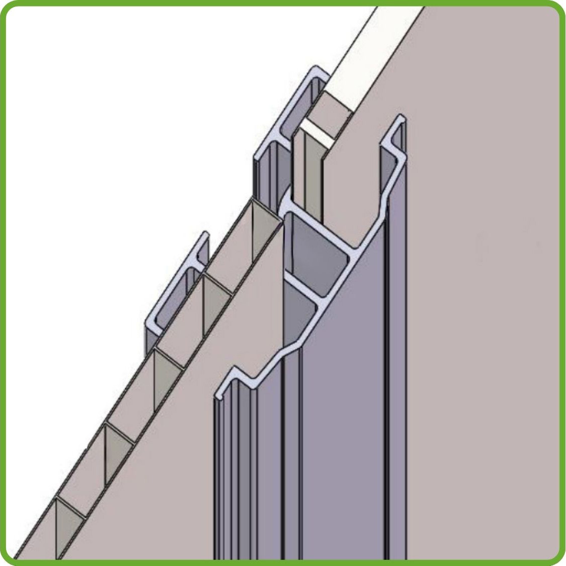 Pokročilý systém Slide-In umožňuje montáž polykarbonátových panelů bez použití kovových sponek, které se zasouvají přímo do rámů konstrukce, což zaručuje výjimečnou stabilitu a trvanlivost konstrukce. Díky tomu je rychlá montáž skleníku snadná i pro začátečníky. Panely jsou pevně uchyceny v rámu, což zajišťuje mimořádnou odolnost proti větru a nepříznivým povětrnostním podmínkám. Absence volných prvků také znamená menší riziko poškození skleníku v dlouhodobém horizontu. Přesné fungování systému je představeno ve videu. Je třeba mít na paměti, že vzhledem ke specifikům montážního systému musí být skleník umístěn nejméně 1,5 metru od budovy, aby byla zajištěna správná instalace a ventilace.