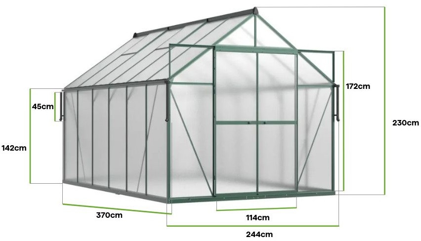 Zahradní skleník z polykarbonátu Slide-In NEW 244x370cm Dark Green značky Cultivo s vyztuženou konstrukcí je ideálním řešením pro ty, kteří ocení funkčnost ve své zahradě. Hluboká tmavě zelená barva harmonicky ladí s okolím a podtrhuje přirozený charakter prostoru. Impozantní rozměry skleníku, s délkou 370 cm a šířkou 244 cm, umožňují všestranné pěstování zeleniny, ovoce, květin a bylinek, a to i ve větším měřítku. Odolné polycarbonátové panely o tloušťce 4 mm s UV ochranou zajišťují optimální podmínky pro růst rostlin, účinně chrání před intenzivním slunečním zářením a udržují stabilní teplotu. Konstrukce založená na hliníkovém rámu a pozinkované ocelové základně zaručuje výjimečnou odolnost a odolnost proti nepříznivým povětrnostním podmínkám. Inovativní systém Slide-In, založený na zasouvacích panelech, výrazně usnadňuje montáž a zlepšuje stabilitu celé konstrukce. Dvojité posuvné dveře o rozměrech 172 x 114 cm zajišťují pohodlný přístup dovnitř a čtyři ventilační okna podporují správnou cirkulaci vzduchu. Dvě vodorovné příčky zpevňují střechu skleníku a zvyšují jeho odolnost proti sněhu a větru. Skleník je také vybaven praktickou okapovou žlabem, zavěšeným ve výšce 97 cm a o délce 45 cm, který umožňuje sběr dešťové vody – ekologické řešení podporující zavlažování plodin.