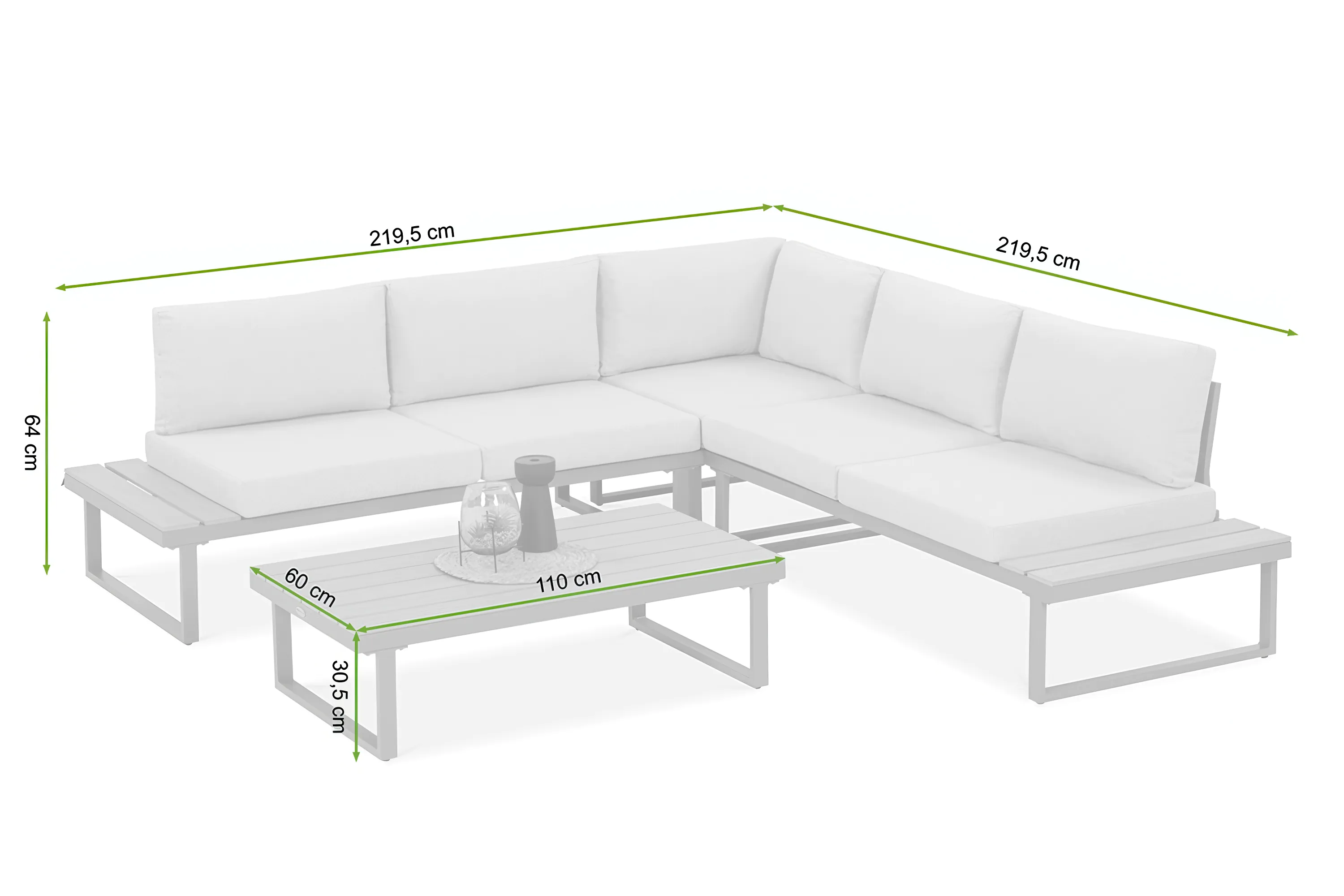 - celá rohová sedací souprava: délka - 219,5 cm, šířka - 219,5 cm, výška - 64 cm