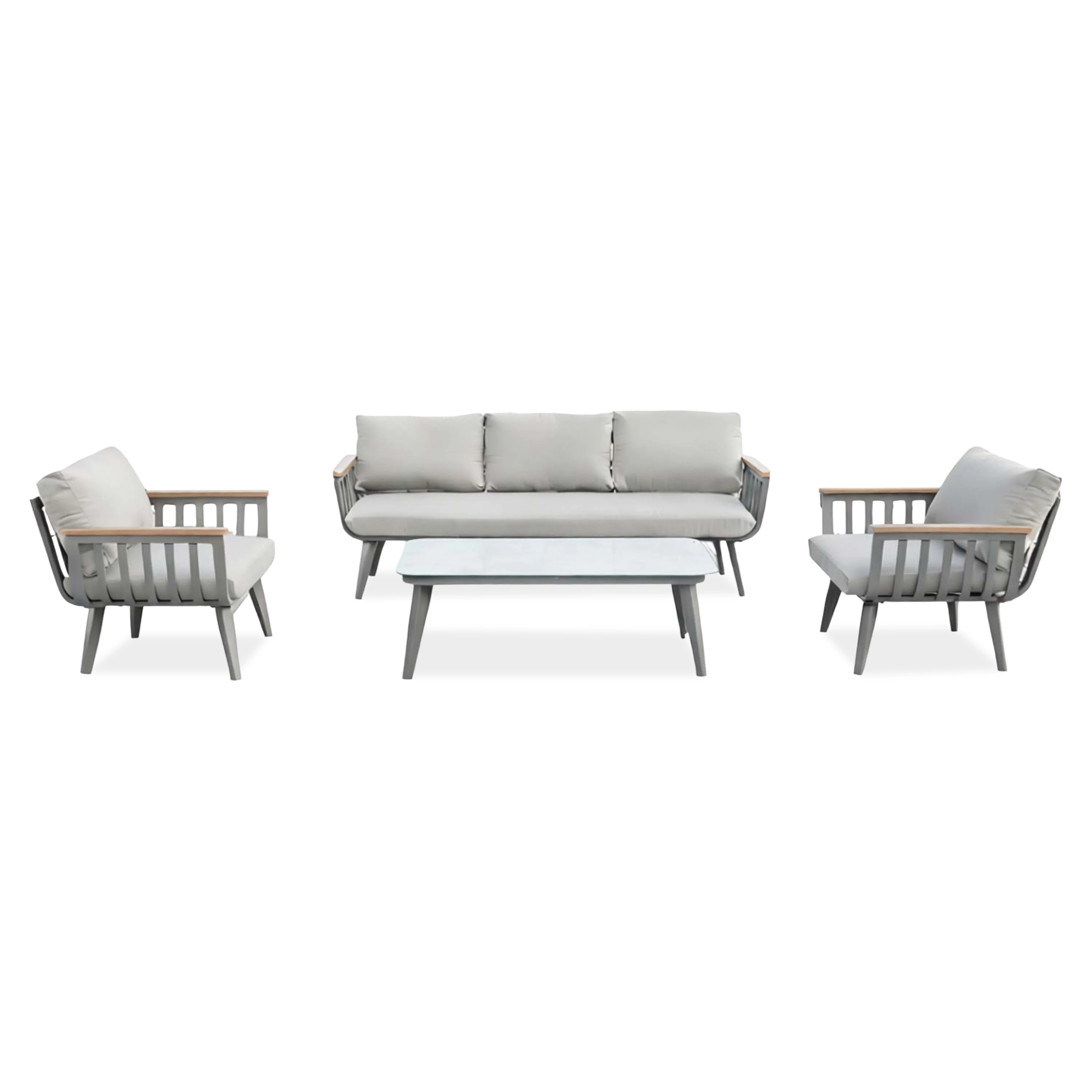 Souprava terasového nábytku STELLA CAFFE Taupe od společnosti FURROREE je umnou kombinací minimalistického hliníku s jemnou povrchovou úpravou polywoodu a deskou z keramického skla. Tato designová kávová souprava pro 5 osob zaujme svou lehkou formou a odolností vůči UV záření. Světle šedé měkké polštáře s funkcí snadného čištění zaručují pohodlí na zahradě nebo na terase. Vyberte si prestiž a nadčasovou bílou barvu, která se dokonale hodí ke skandinávskému stylu a moderním venkovním aranžmá.
