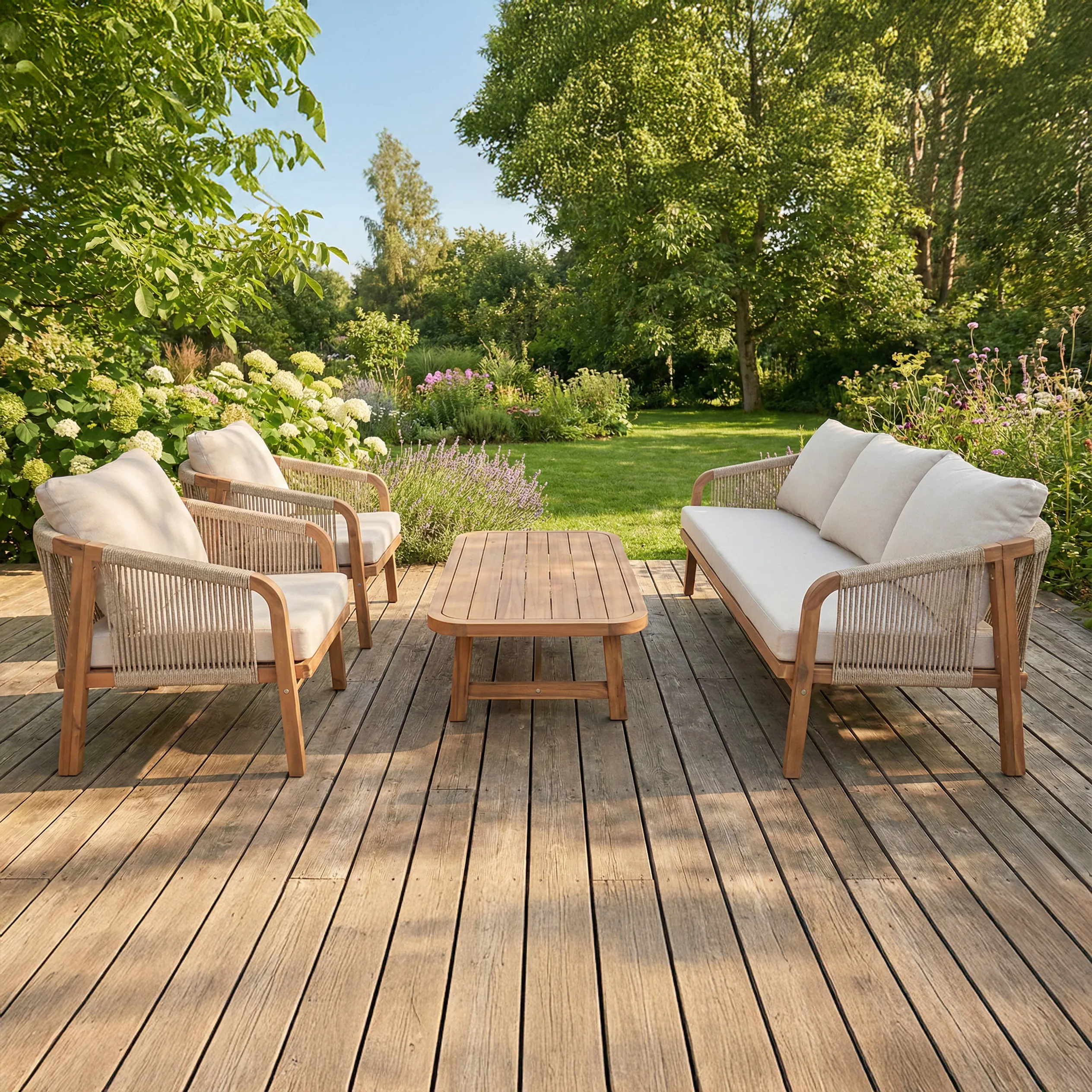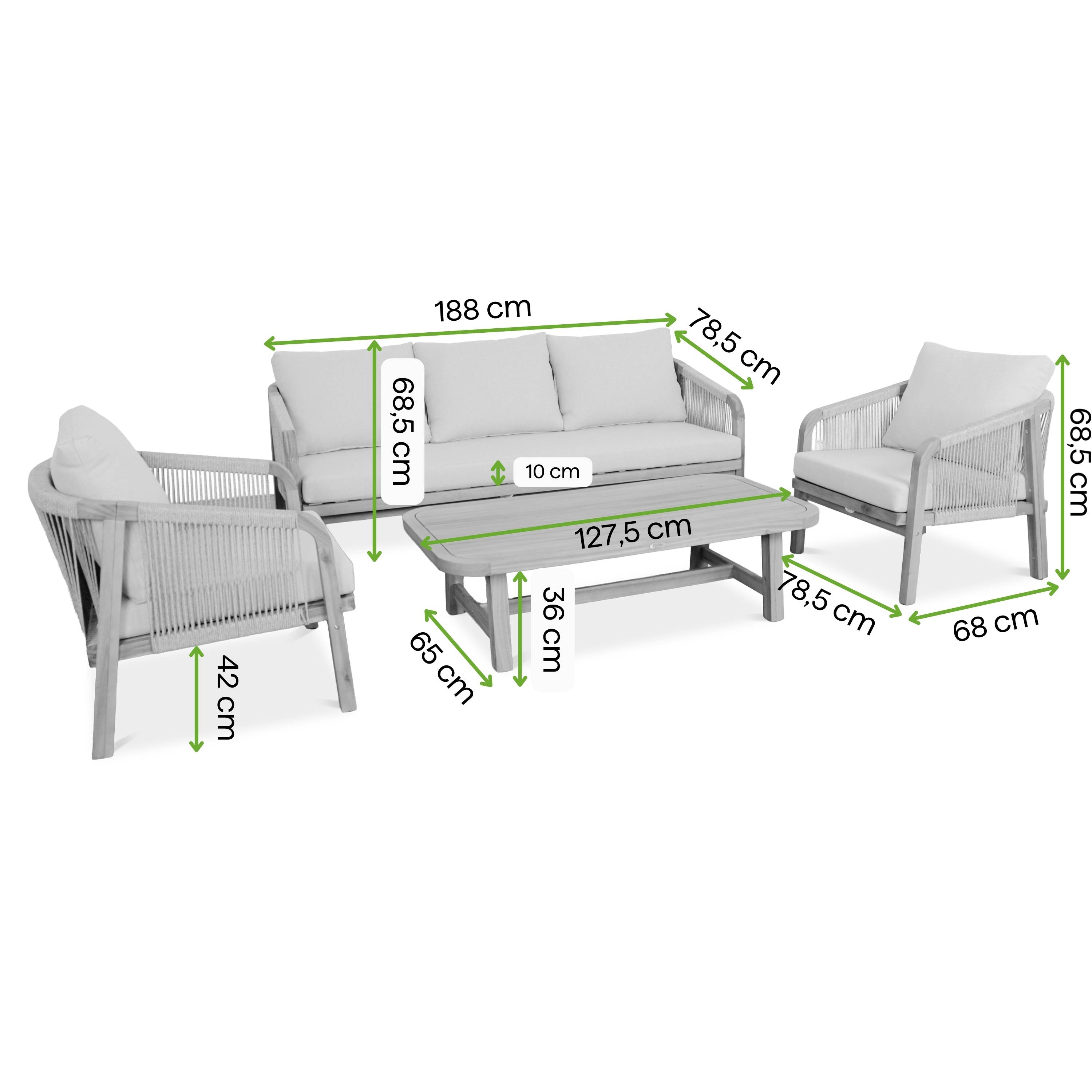 Objevte luxusní soupravu lounge nábytku SKALA CAFFE z akáciového dřeva od společnosti Bjørkka, která spojuje prestiž akáciového dřeva s certifikátem FSC a moderní design. Jedinečný charakter dodává jemné polyesterové lano, které vytváří ažurovou konstrukci. Souprava obsahuje 3místnou pohovku, 2 křesla a konferenční stolek s deskou o tloušťce 4 cm. O pohodlí se starají měkké 10cm polštáře sedadel se snímatelnými potahy. Jedná se o ideální lounge nábytek na terasu nebo zahradu, který definuje styl a odolnost.