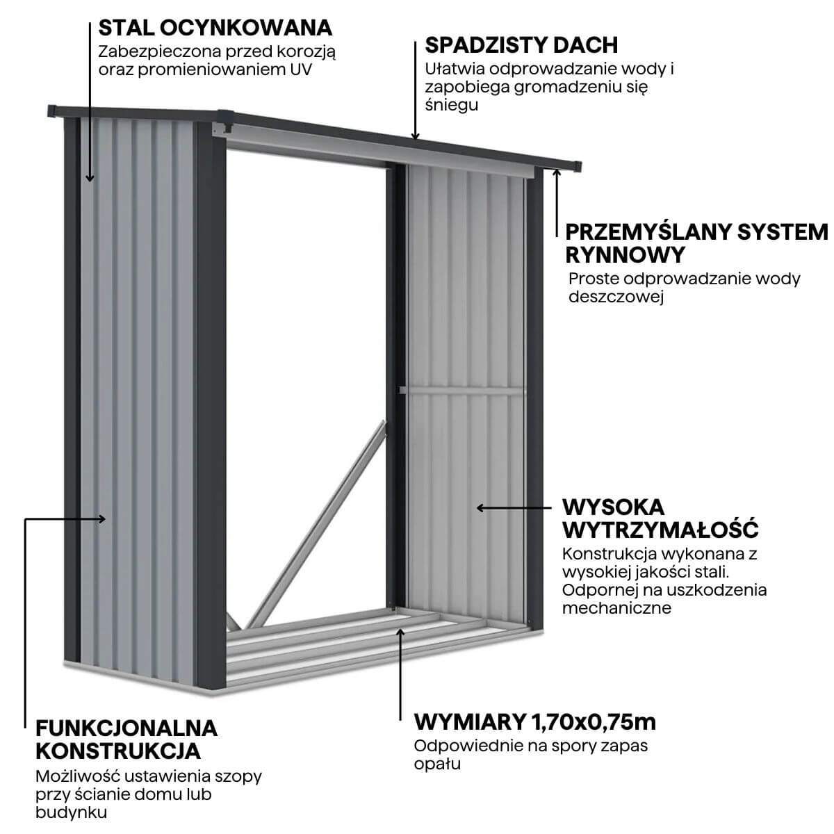 Praktický a estetický přístřešek na dřevo Denver je skvělou volbou pro ty, kteří hledají místo pro uskladnění palivového dřeva a zahradních doplňků. Odolná konstrukce z kovových panelů na ocelovém rámu zajišťuje trvanlivost a odolnost vůči nepříznivým povětrnostním podmínkám. Díky okapovému systému je voda účinně odváděna, což zabraňuje navlhnutí uskladněného materiálu. Jemná barva přístřešku na dřevo dokonale ladí s přírodním prostředím zahrady.
