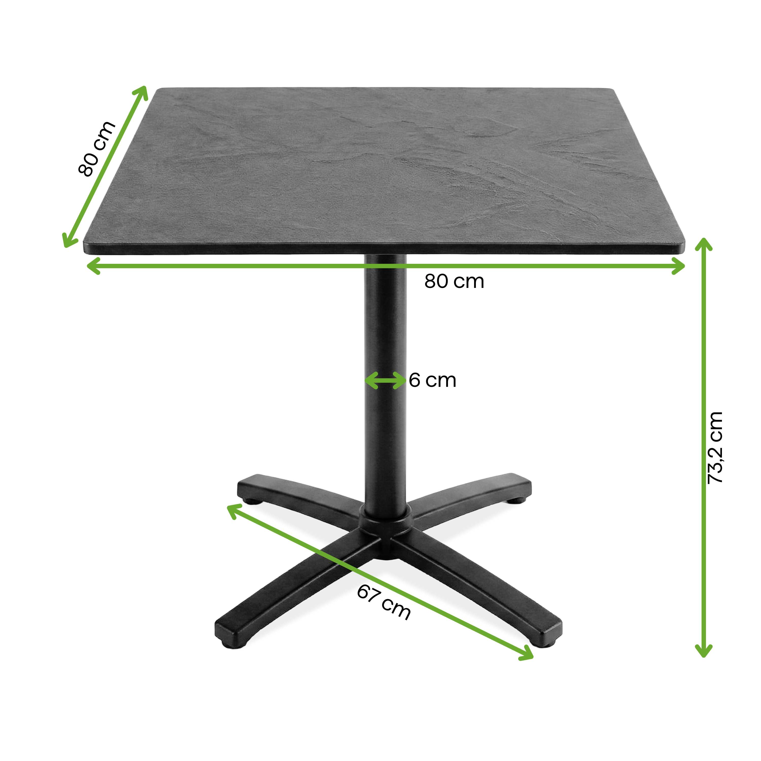 Stůl s hliníkovou podnoží ALVIA/VENA 80 cm - Bjørkka je moderní sestava navržená pro dlouhou životnost a intenzivní používání. Deska VENA 80 ANTHRACITE MARBLE z HPL laminátu se vyznačuje vysokou odolností proti poškrábání, oděru, nárazům a UV záření, díky čemuž si dlouho zachovává estetický vzhled. Neporézní, hygienický povrch neabsorbuje vlhkost a je snadný na údržbu, což činí stůl ideálním do restaurací, kaváren, kanceláří a veřejných prostor. Stabilní podnož ALVIA Black z hliníku lakovaného pískově černou barvou spojuje lehkost s pevností. Konstrukce vysoká 72 cm s křížovým sklápěcím upevněním zajišťuje pevnou oporu desce 80×80 cm a pohodlí při používání i skladování.