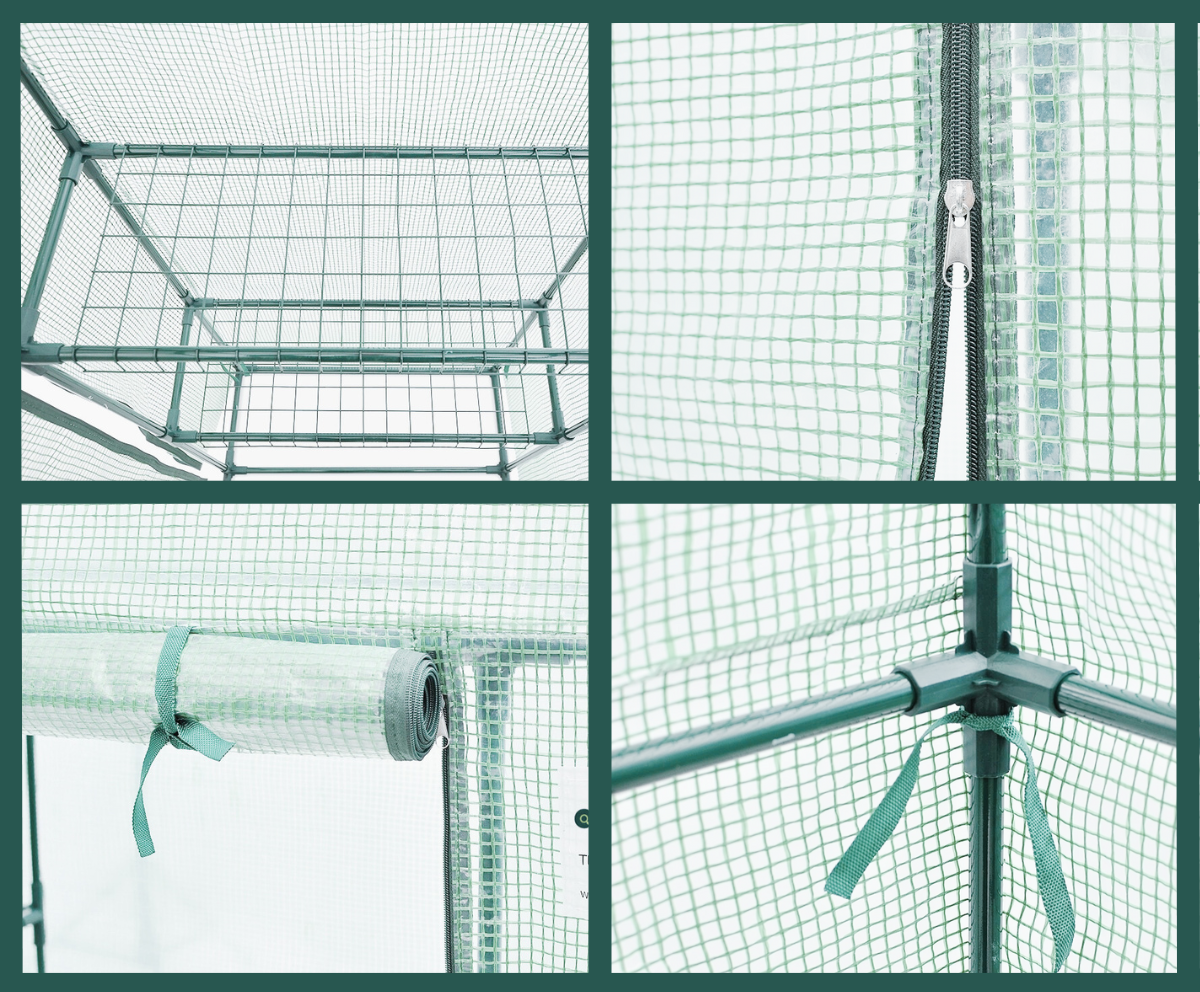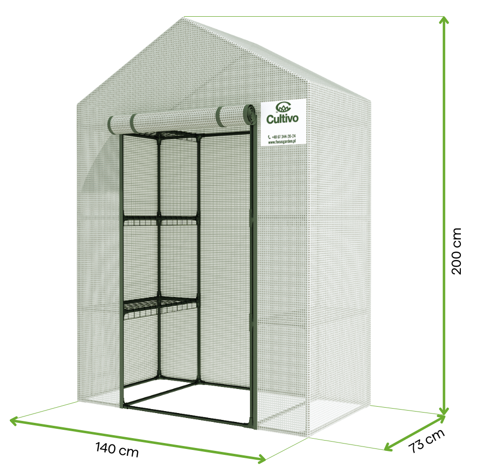 Zahradní skleník s policemi je ideálním řešením pro vášnivé pěstitele rostlin, kteří chtějí vytvořit optimální podmínky pro pěstování svých rostlin, aniž by museli investovat do nákladných konstrukcí. Lehký, ale pevný ocelový rám a kryt ze silné PE fólie 140 g/m² se vstřikovanou bílou PP síťovinou zajišťují odolnost a účinnou ochranu před měnícími se povětrnostními podmínkami. Díky svým kompaktním rozměrům je ideální pro použití na zahradě, na pozemku, nebo i na větším balkoně či terase.