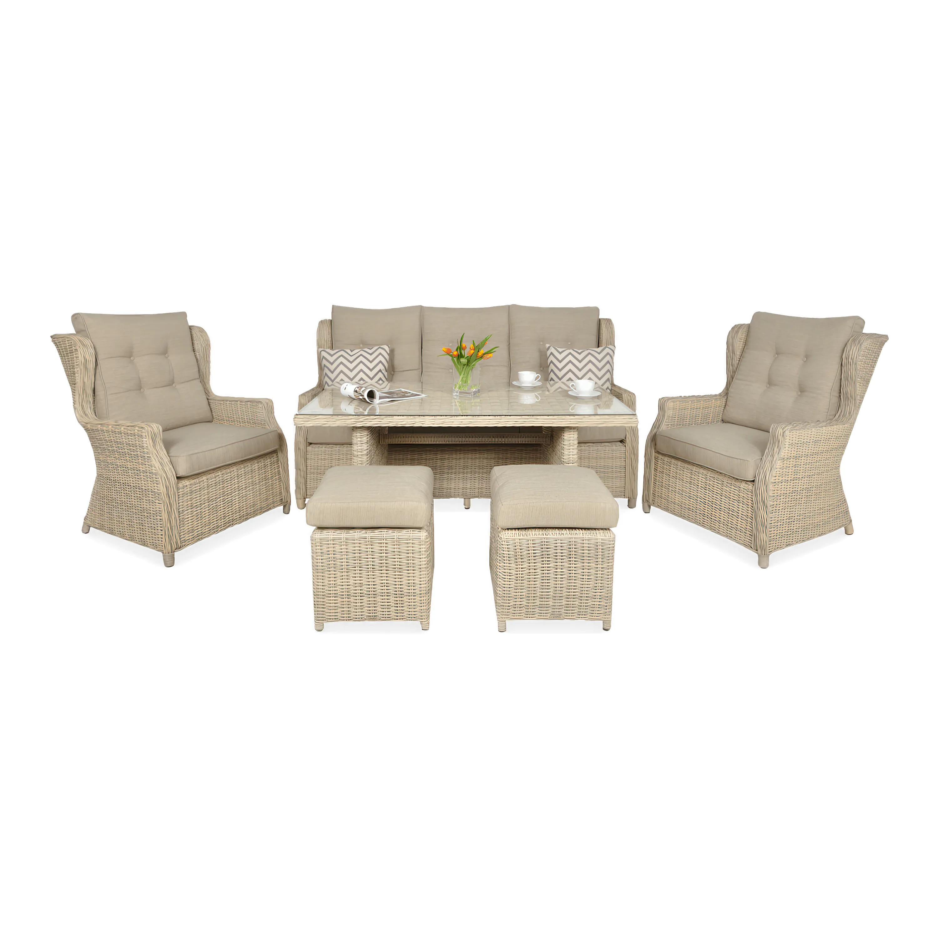- složení soupravy: Složení: 3místná pohovka, 2 křesla, 2 pufy, obdélníkový stůl vysoký 65 cm s deskou z tvrzeného skla.