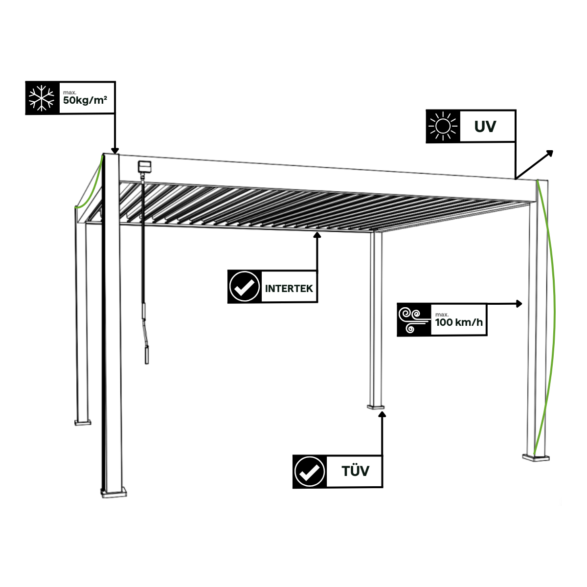 Pergola Gutroof DELUXE byla navržena s důrazem na trvanlivost a bezpečnost – hliníková konstrukce je odolná vůči korozi, UV záření i proměnlivým povětrnostním podmínkám. Odolá poryvům větru až 100 km/h a sněhovému zatížení do 50 kg/m². Kvalitu a odolnost potvrzují certifikáty TÜV a Intertek.
