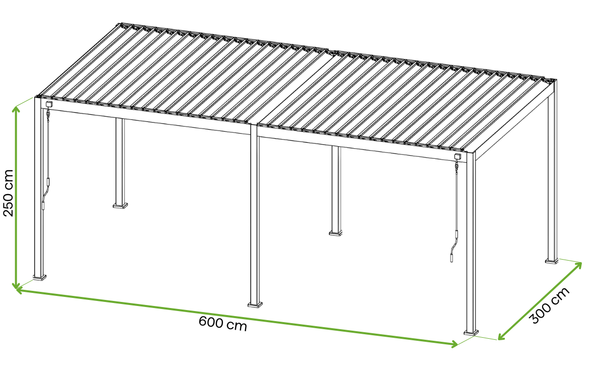 Střešní lamely pergoly, které jsou nastavitelné v rozmezí 0° až 90°, umožňují plynule měnit úhel sklonu. Poloha 0° poskytuje úplnou ochranu před sluncem a deštěm a vytváří uzavřenou stříšku, zatímco nastavení 90° umožňuje úplné otevření střechy, což maximalizuje větrání a přístup světla.