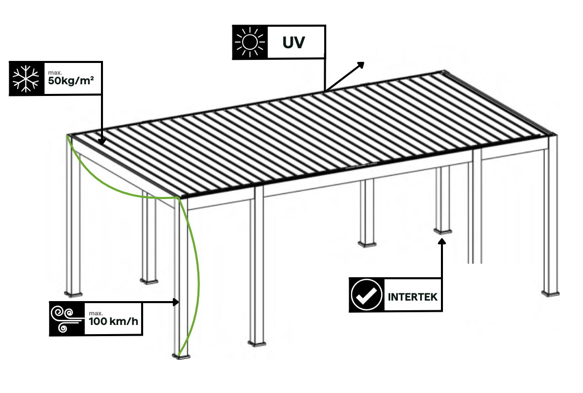 Pergola Gutroof REFERENCE FULL AUTOMATIC byla navržena s ohledem na odolnost a bezpečnost - hliníková konstrukce je odolná vůči korozi, UV záření a měnícím se povětrnostním podmínkám. Odolá nárazům větru o rychlosti až 100 km/h a zatížení sněhem až 50 kg/m² . Kvalitu a odolnost potvrzují certifikace TÜV a Intertek.