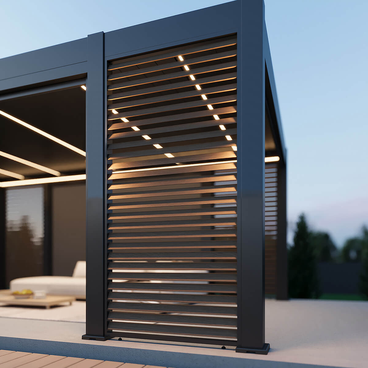 Výrobek se dodává se čtyřmi žaluziovými panely s dekorativní kresbou dřeva - dva jsou namontovány na přední a dva na zadní straně pergoly. Poskytují estetickou úpravu konstrukce a dodatečnou ochranu před větrem a nízkým sluncem. Kromě toho jsou součástí dodávky čtyři automatické rolety, namontované po jedné na každé straně pergoly, které umožňují rychlé a pohodlné přizpůsobení prostoru aktuálním podmínkám a potřebám. Tyto rolety lze ovládat dálkovým ovladačem pro maximální pohodlí a snadné používání.