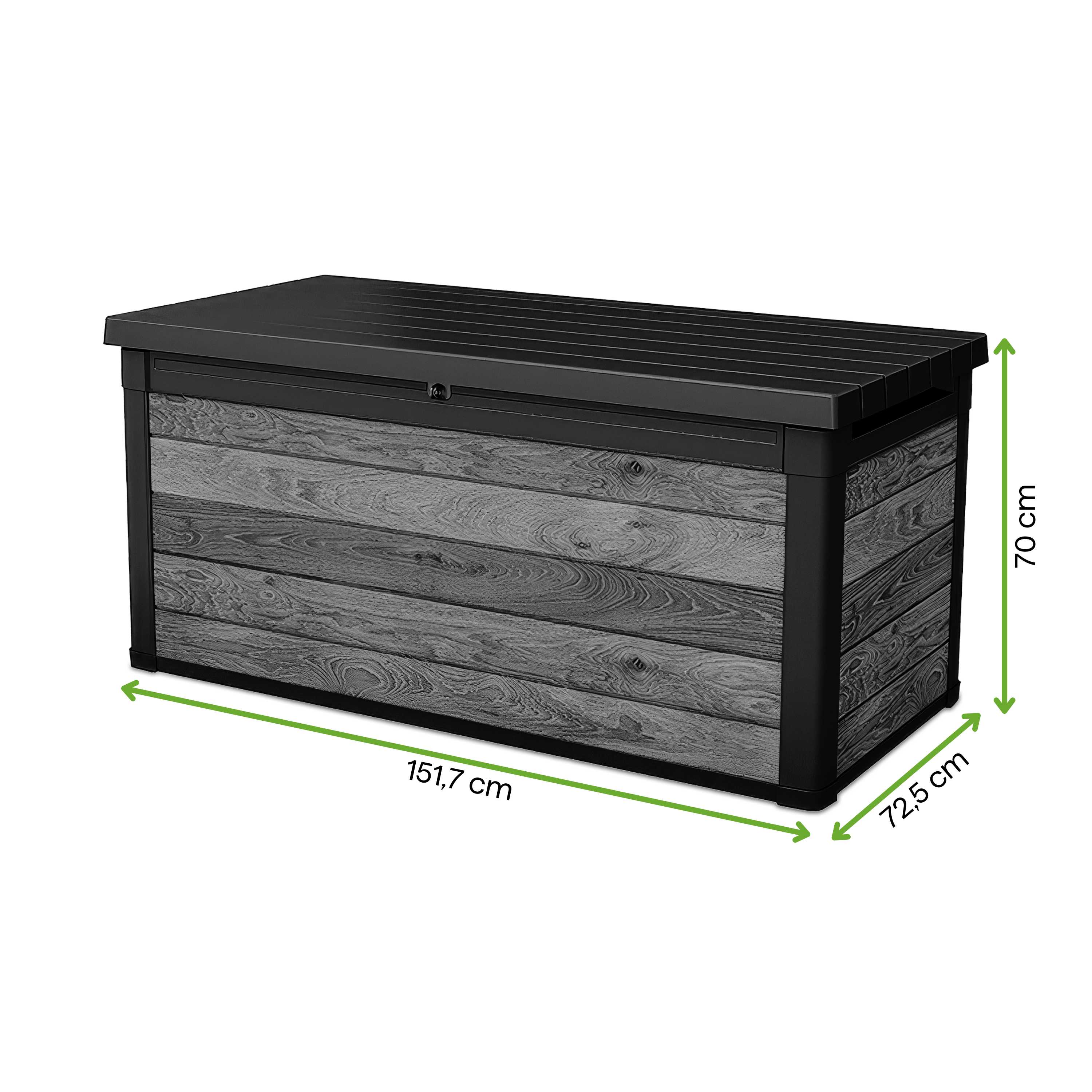 Terasový box Ashwood DECO DEC BOX o objemu 570 l od společnosti Keter je funkčním a estetickým řešením pro ukládání příslušenství na terasu, polštářů a zahradního nářadí. Objem 570 l poskytuje dostatek prostoru pro uspořádání vašeho prostoru, zatímco robustní konstrukce s rozměry 151,7 × 72,5 × 70 cm umožňuje jeho pohodlné umístění na terase nebo na zahradě. Technologie DecoCoat dodává povrchu realistický efekt dřeva a zároveň chrání materiál před vyblednutím, loupáním a rzí. Víko se systémem pohonu zajišťuje hladké otevírání a zavírání, zatímco možnost uzamčení visacím zámkem zvyšuje bezpečnost uložených předmětů.