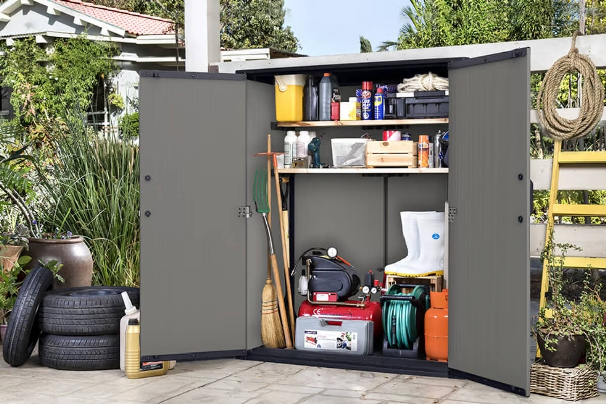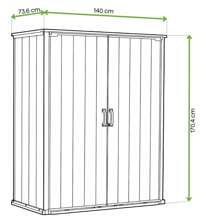 Skříň pojme nejen zahradní nářadí, ale také květináče, polštáře, sezónní doplňky nebo drobný nábytek. Promyšlený vnitřní prostor umožňuje pohodlné a funkční uspořádání obsahu.