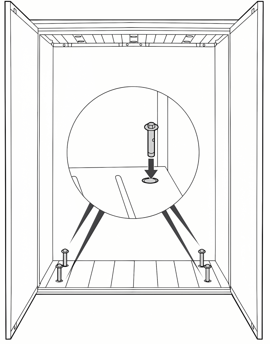 Skříňka musí být bezpečně připevněna k podlaze na určených místech v podlaze. Upevňovací šrouby nejsou součástí dodávky - jejich výběr závisí na typu podlahy.