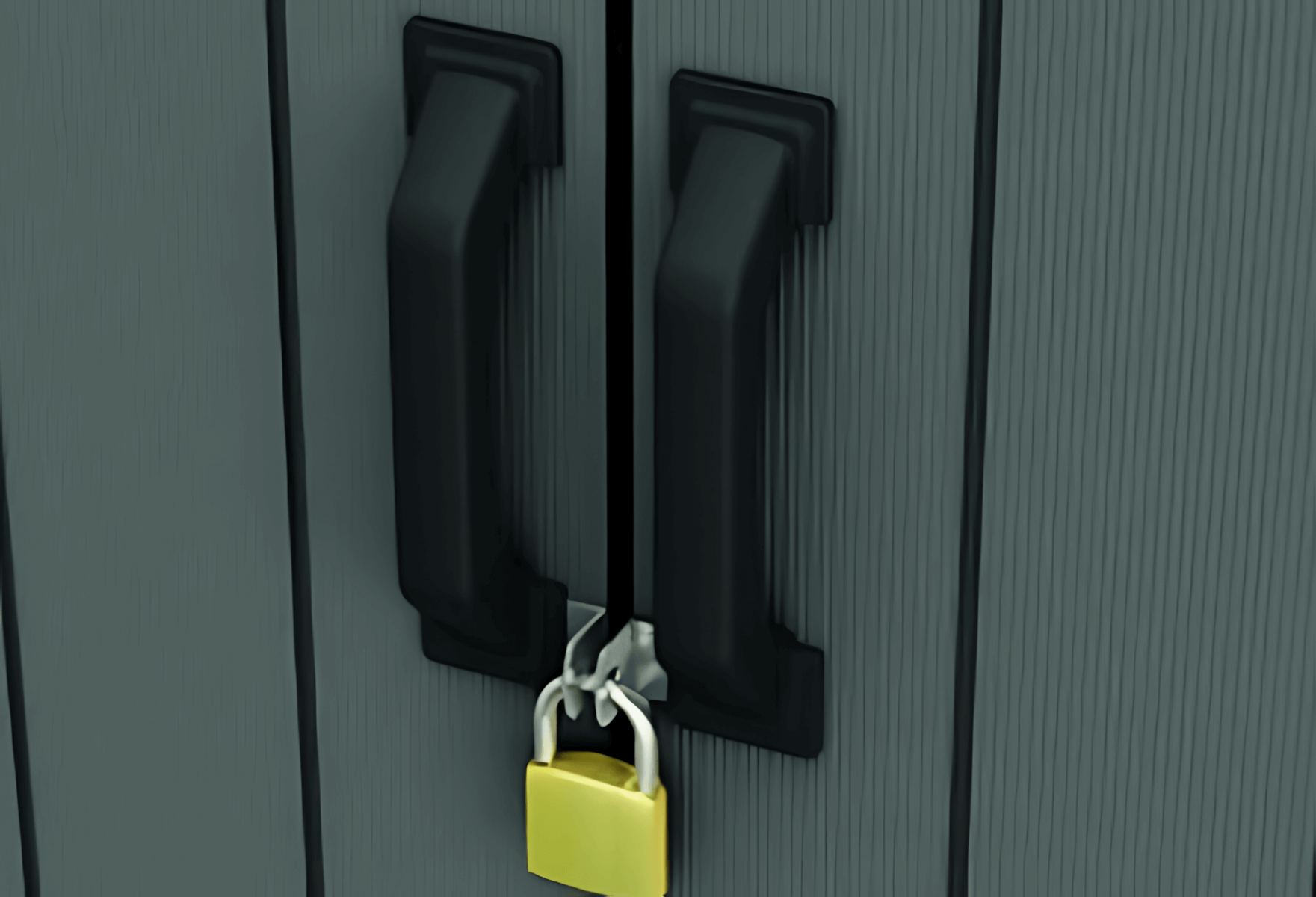 Dveře skříně jsou opatřeny úchyty umožňujícími uzamčení visacím zámkem, což zvyšuje bezpečnost uloženého zahradního nářadí a příslušenství.