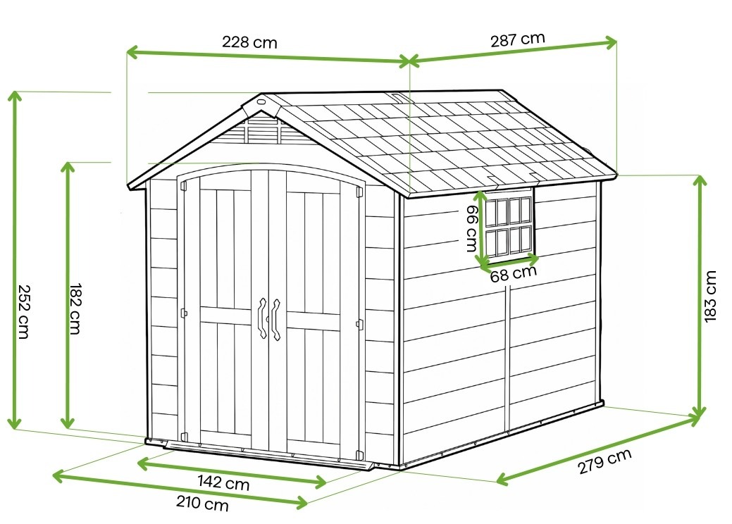 Zahradní domekPremier 759 je zdařilou kombinací klasického designu a moderní funkčnosti. Je vyroben z odolného polypropylenu o tloušťce 16 mm, nevyžaduje nátěr ani impregnaci a díky odolnosti proti UV záření si zachovává svůj estetický vzhled po mnoho let. Kovové vyztužení konstrukce a ventilační systém zaručují dlouhou životnost a komfort používání. Vestavěné okno a střešní světlíky propouštějí přirozené světlo, a těsná podlaha účinně izoluje interiér od vlhkosti. Na výrobek se vztahuje 10letá záruka výrobce.